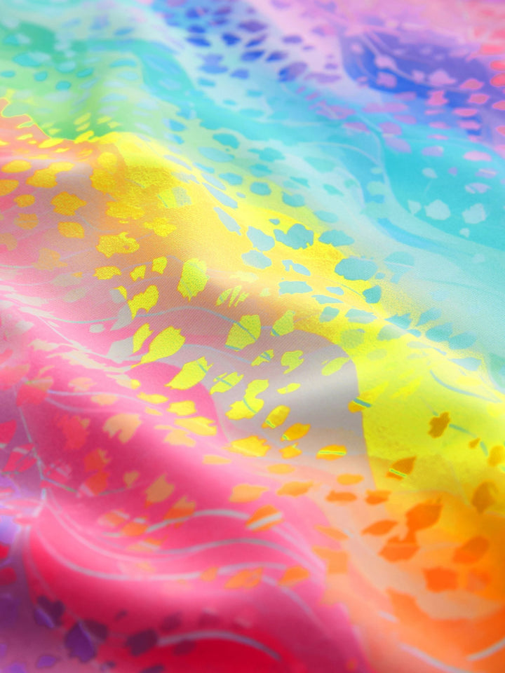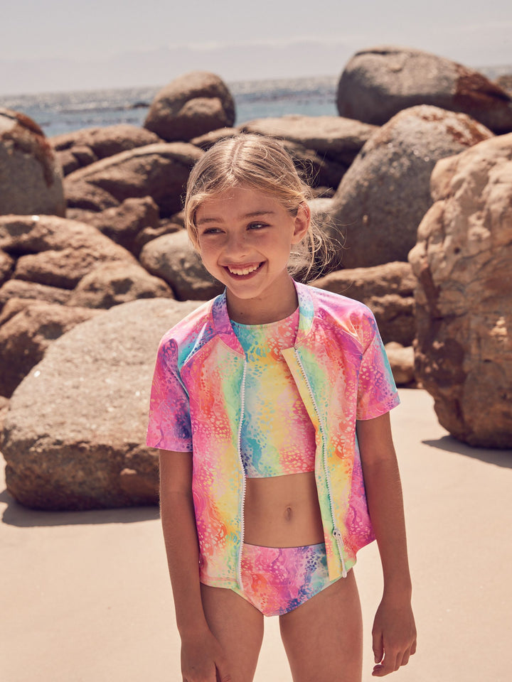 Keep them safe and stylish with this cool short-sleeve rash vest. Made with UVA 50+ protection fabric in a vibrant rainbow animal print. It is also easy to take on and off with a full front zip fastening. Animal print Front zip fastening UVA 50+ protection Matching swimwear available Machine washable. 84% Recycled polyester, 16% Elastane. Country of Origin: China This fabric will provide protection against solar ultraviolet radiation. It has been independently tested and given a UPF rating of 50+ which blocks more than 97.5% of UV rays. Important Advice: • Sun exposure causes skin damage • Only covered areas are protected • Always use a high protection factor sunscreen on any exposed areas of skin • The protection offered by this fabric may be reduced with use or if stretched or wet • Always rinse in fresh water after each use • Young children should be kept in the shade between 11 and 3 • Don't forget your hat and sunglasses. • Fabric provides UVA +UVB protection from the sun.