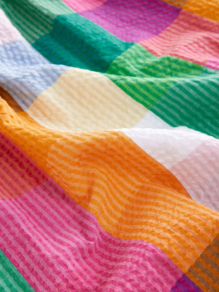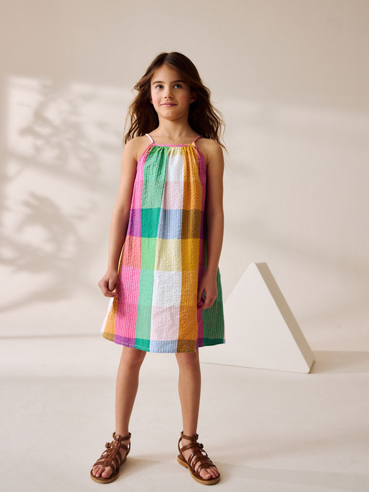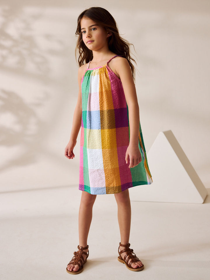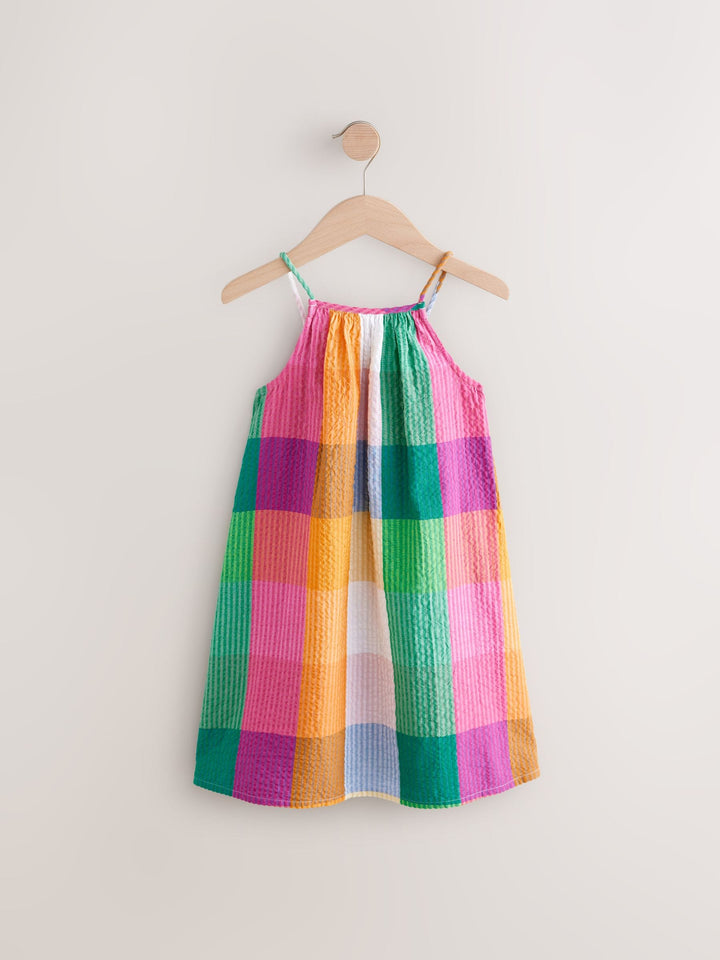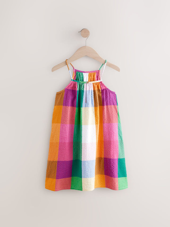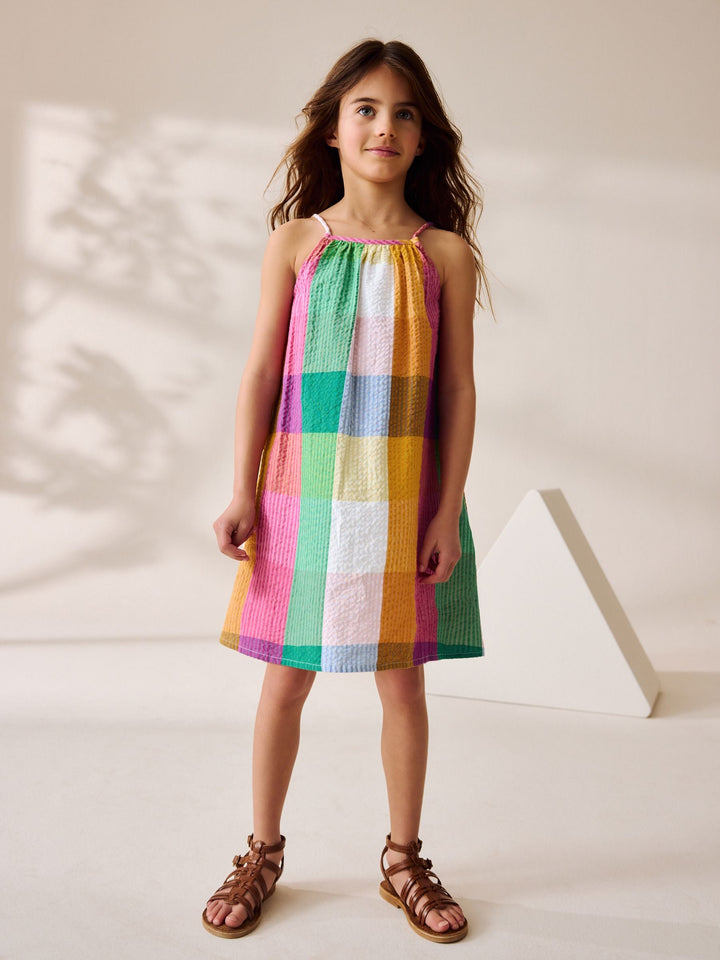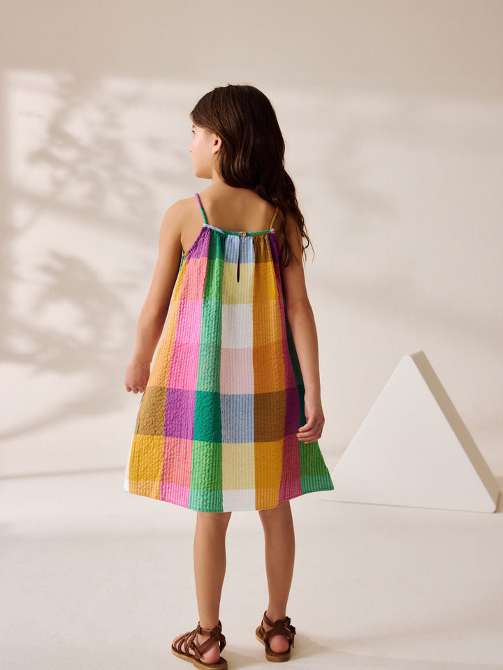 Get her ready for summer with this cute and colourful rainbow check sundress, made from a crinkle-textured cotton fabric with a breathable feel, finished with thin shoulder straps. 100% cotton Textured fabric Thin shoulder straps Machine washable. 100% Cotton. Country of Origin: India