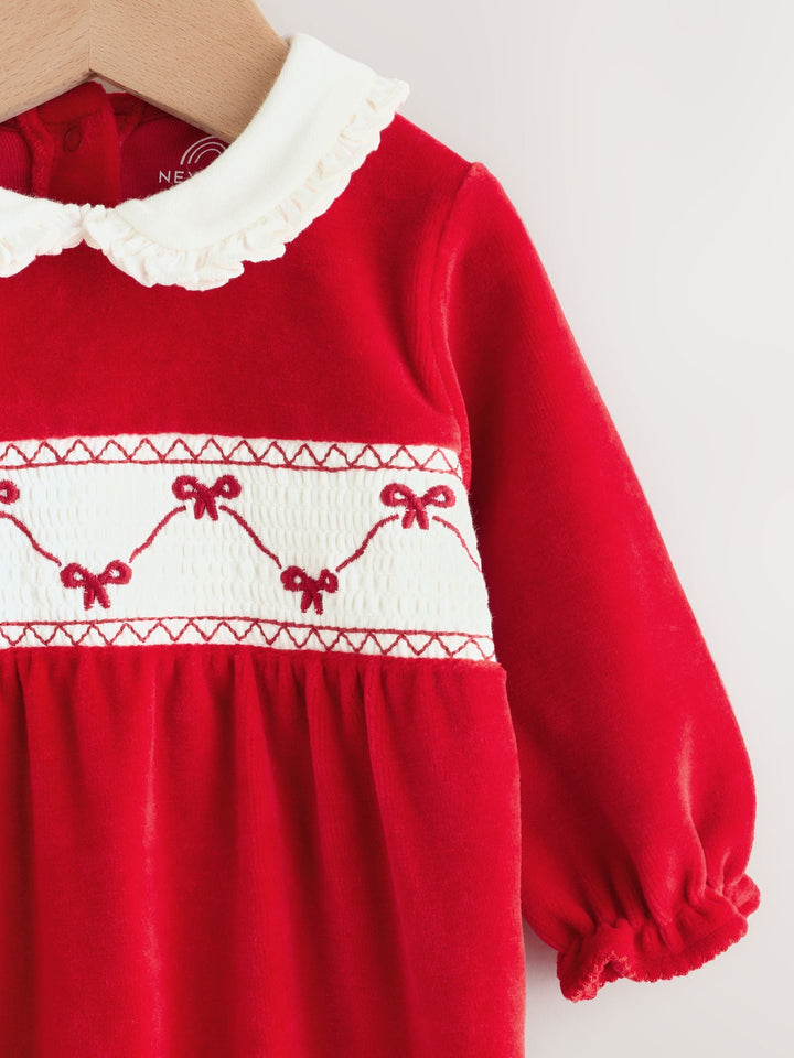 Dress your little one for the festive season in this adorable red velour sleepsuit. The super soft velour and delicate bow smocking detail create a charming, classic look. With a beautiful frilled collar and full back popper fastening, it's a perfect choice for their first holiday photos or special occasions. Super soft velour Bow smocking detail Back popper fastening Inner lined feet Anti-slip sole print from 9-12 months No harmful chemicals or dyes Nickel-free poppers Frilled collar 85% Cotton, 15% Recycled polyester. Country of Origin: India Warning: Keep away from fire and flames.