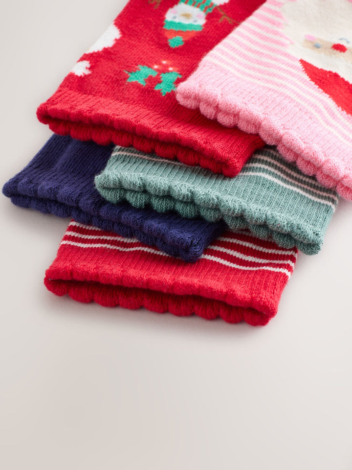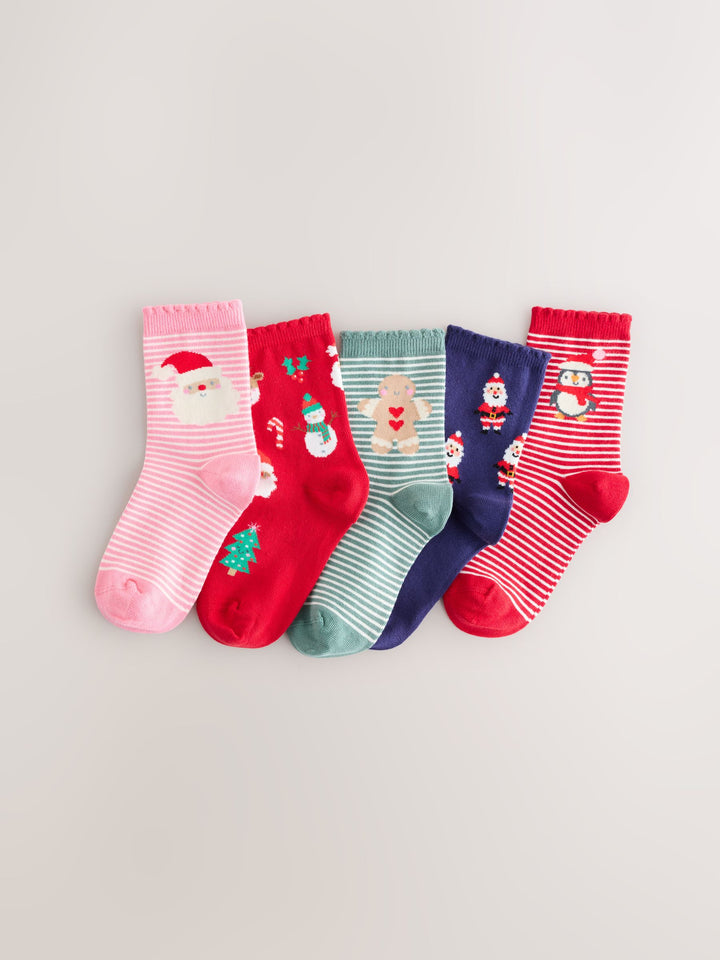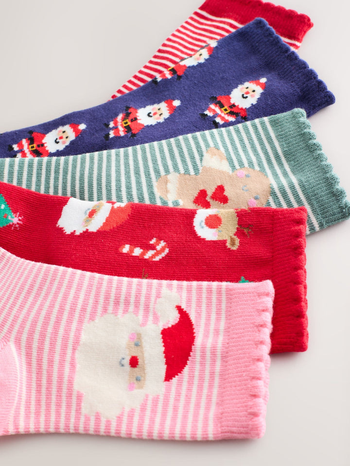 Red Green and Navy Blue Cotton Rich Christmas Character Print Ankle Socks 5 Pack