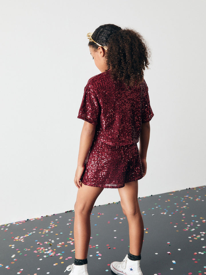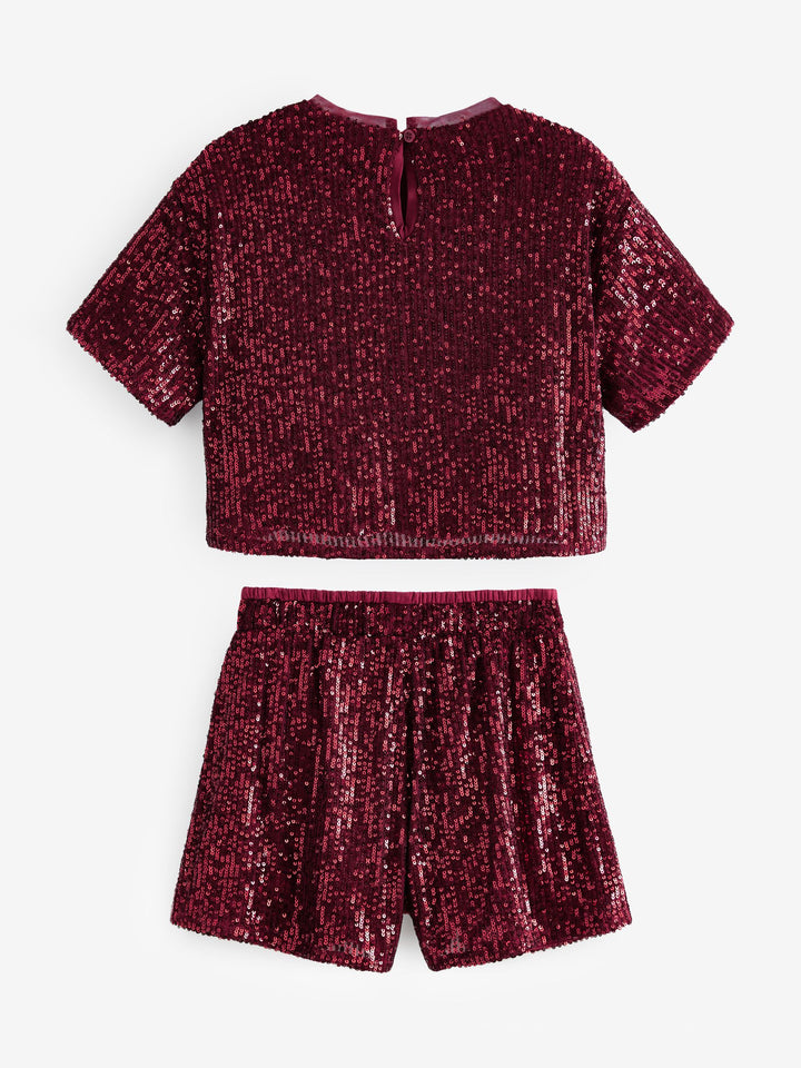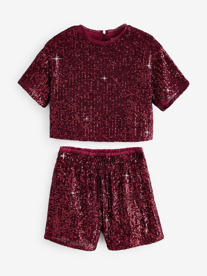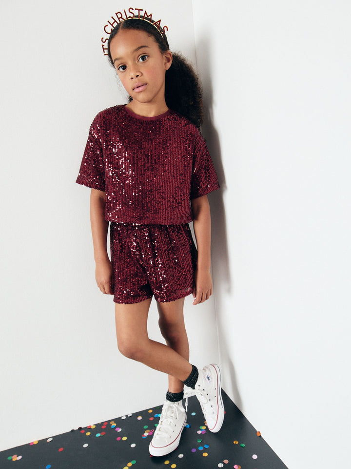 Spread the sparkle with our animal print sequin top and shorts set. Perfect for parties and special occasions, this two piece set includes a relaxed fit t-shirt and elasticated shorts that are both coated in a fun animal print and snazzed up with sequins. 2 piece set Relaxed fit top Elasticated shorts Sequin design Animal print Button-back fastening Machine washable. T-shirt and Shorts Main 95% Recycled polyester, 5% Elastane. Lining 100% Cotton. Country of Origin: Sri Lanka