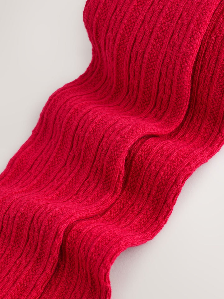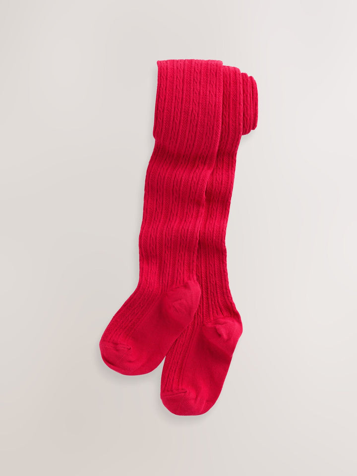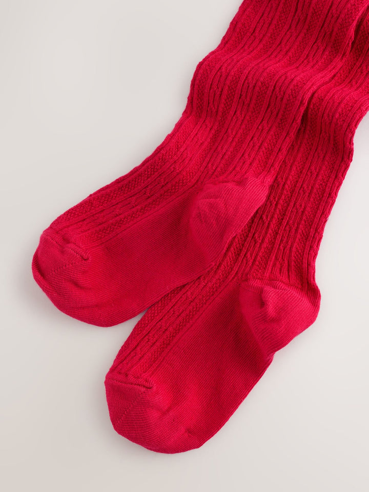 Add a cosy layer of warmth to their outfit with these vibrant red cable tights. The intricate cable design and cotton-rich fabric provide a comfortable feel, perfect for pairing with skirts and dresses. Available in a variety of colours, these tights are a versatile wardrobe essential for any occasion. Cotton-rich fabric Cable design Biome treatment applied to ages 3 years upwards Regular length This product contains the biocide linseed oil Machine washable. 76% Cotton, 21% Nylon, 3% Elastane. Country of Origin: Sri Lanka