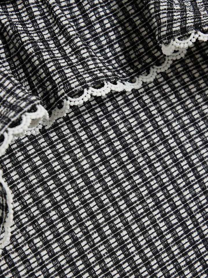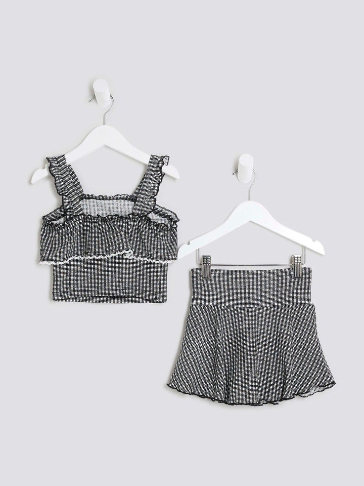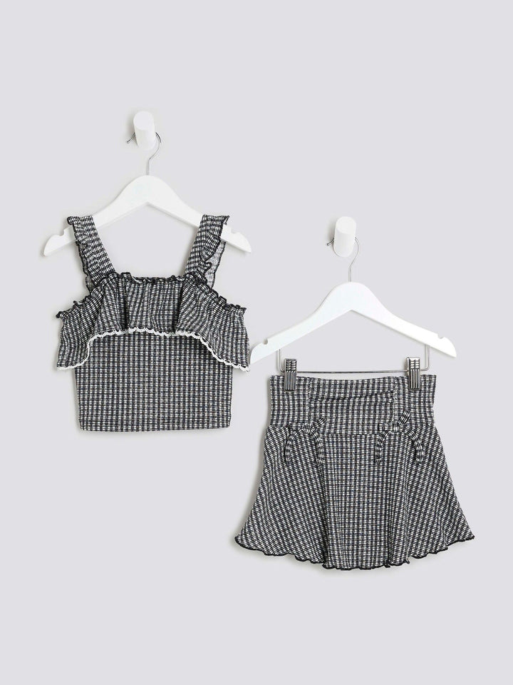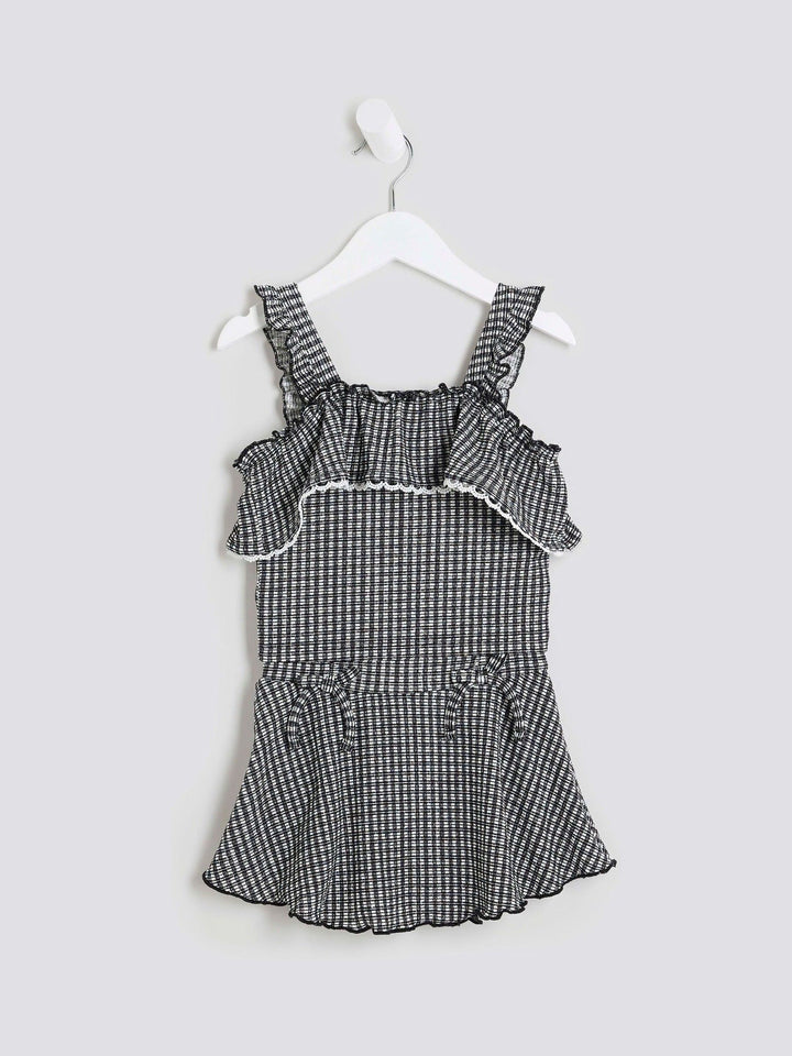 Set of 2 Gingham print Ruched Square neckline Bardot style Frilled Sleeveless Bow detail Lightweight Washable. 99% Polyester, 1% Elastane. Country of Origin: Great Britain