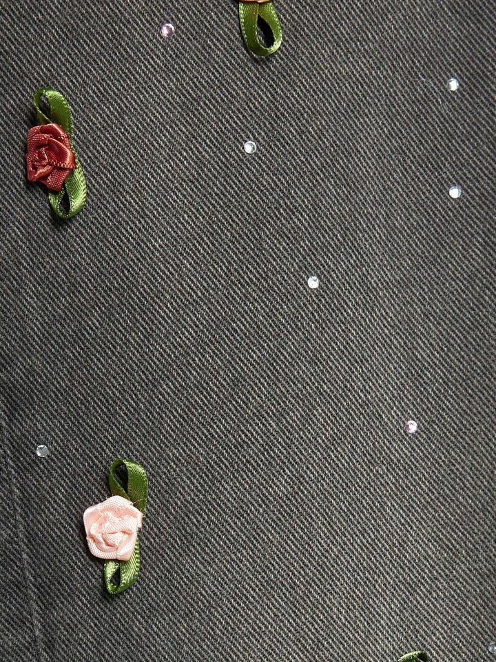 Wide leg Denim fabric Rose applique and diamante embellished Belt loops Classic 5 pockets Button and zip fastening Washable. 100% Cotton. Country of Origin: China