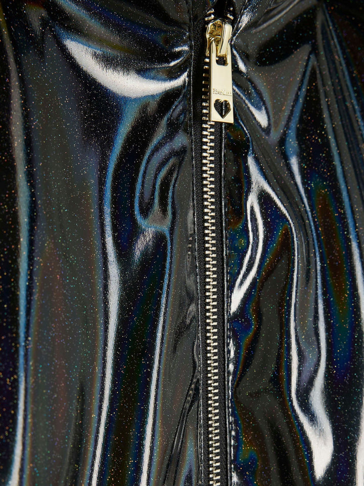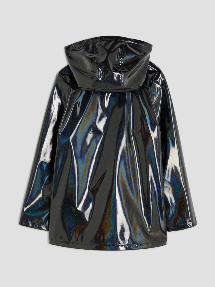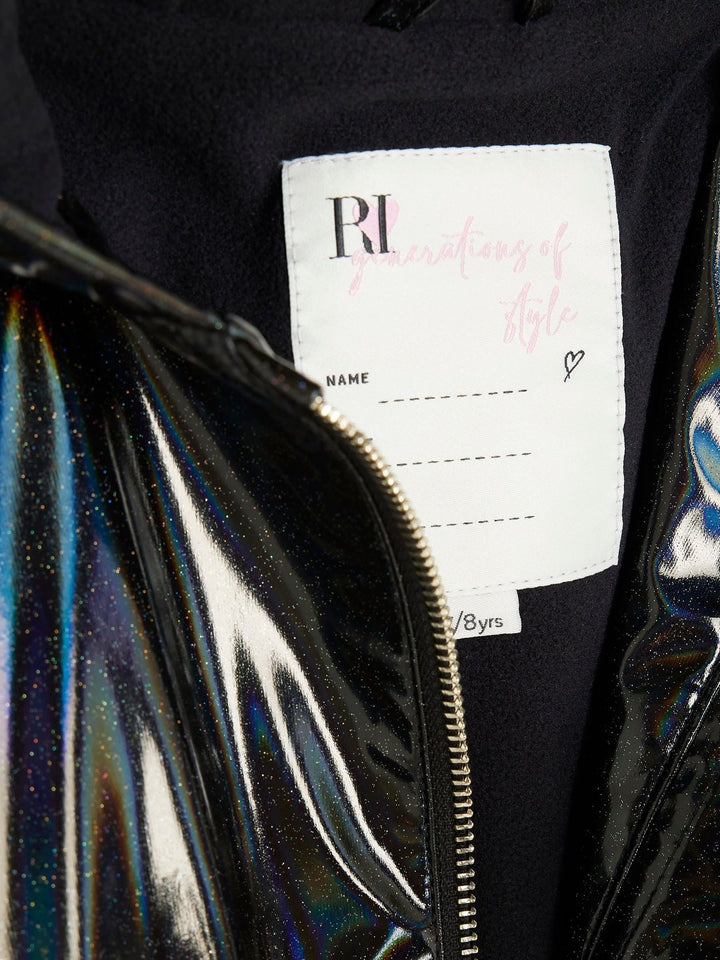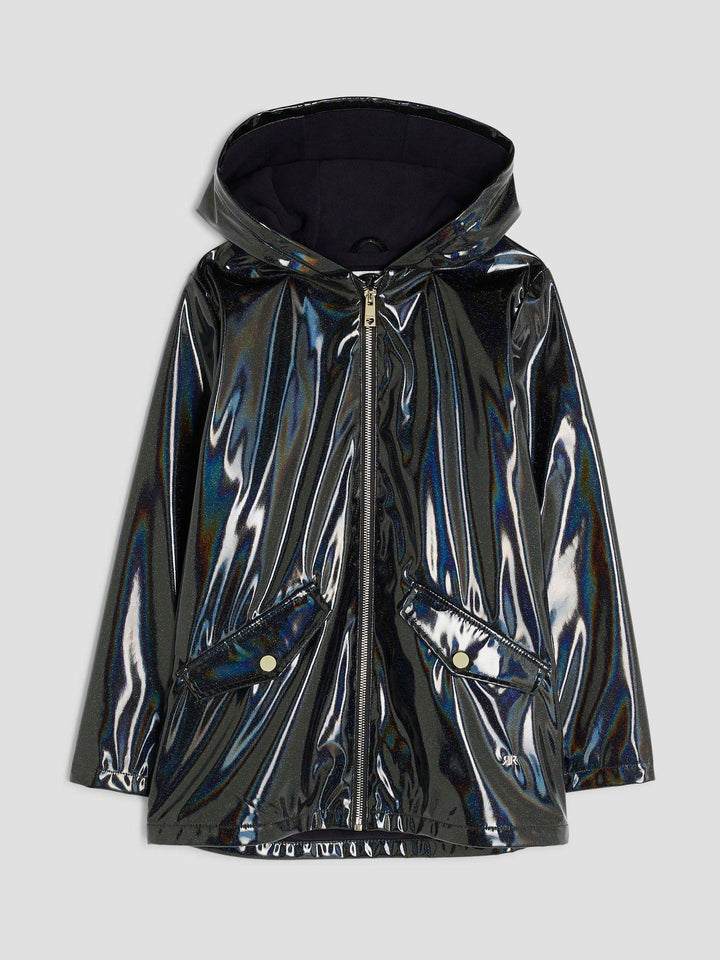 Hooded Glitter style Stud press pockets Zipped fastening Long sleeves Showerproof Fleece lined Washable. 100% Polyester. Country of Origin: Great Britain
