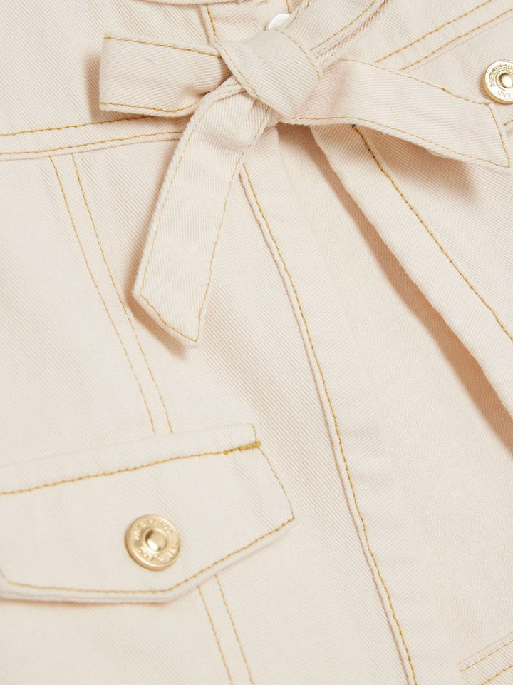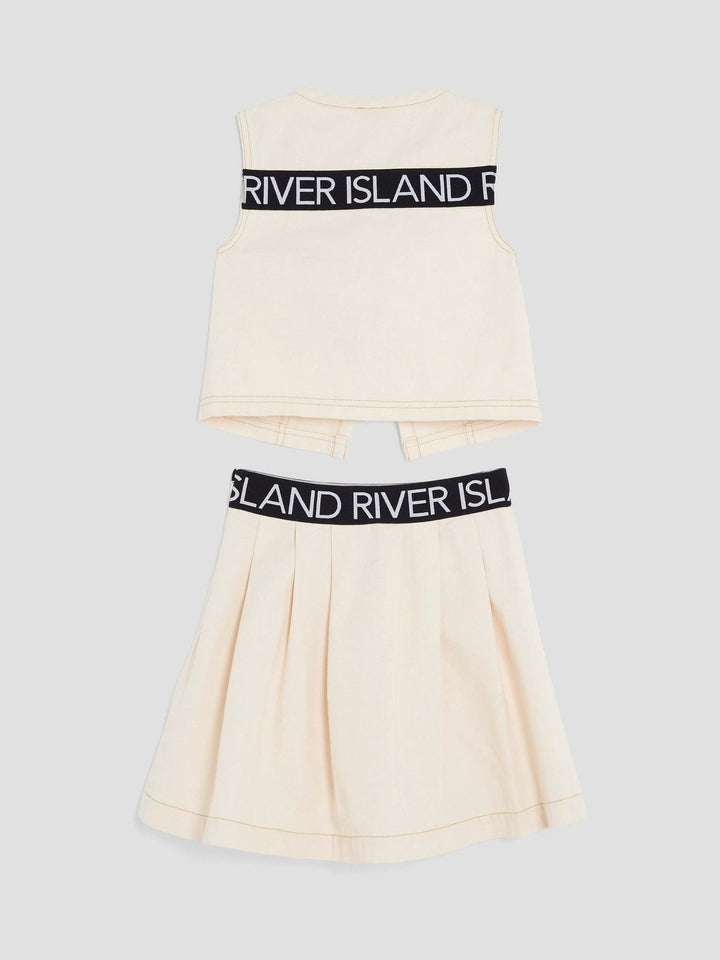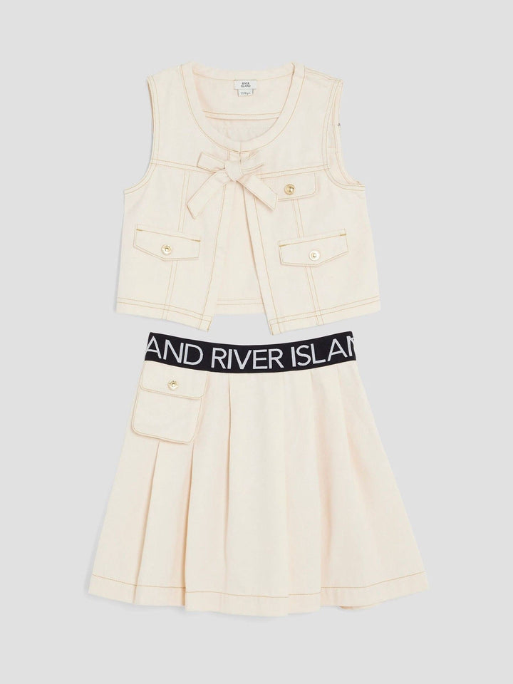 Set of 2 Denim fabric Gilet Round neck Decorative stud pressed pockets Buttoned fastening Bow detail Sleeveless Skirt RI waistband Stud pressed pockets Washable. 100% Cotton. Country of Origin: Great Britain