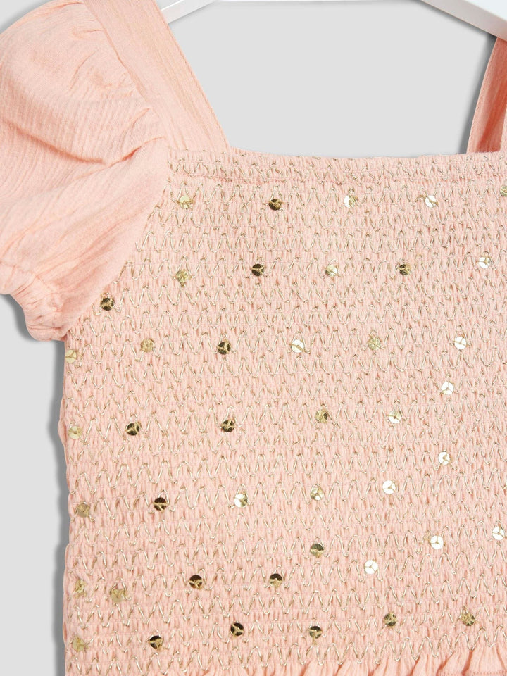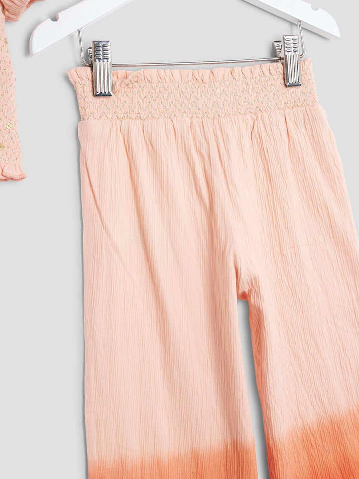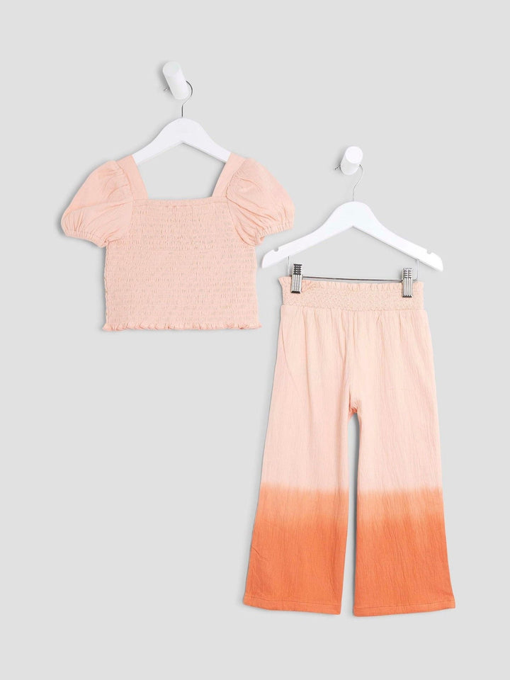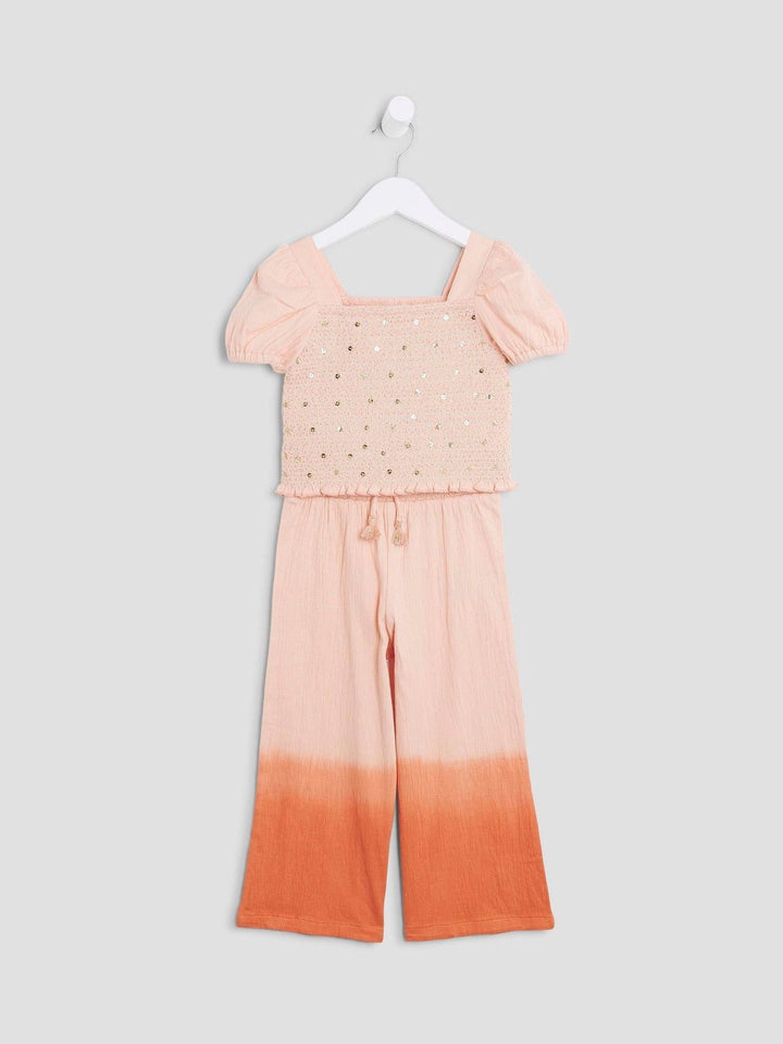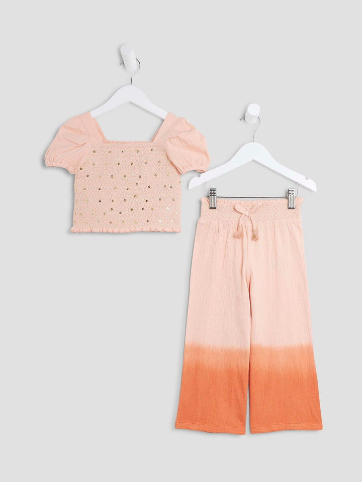 Set of 2 Ombre style Orange Square neckline Sequin detail Puff mid sleeves Lightweight Trousers Elasticated drawstring waist Machine washable. 95% Cotton, 4% Polyester, 1% Elastane. Country of Origin: Great Britain
