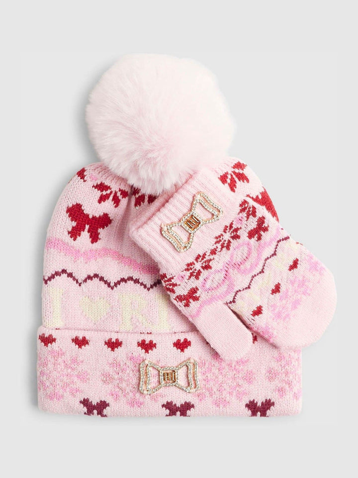 River Island Pink Fairisle Pattern Beanie & Gloves Bundle Set