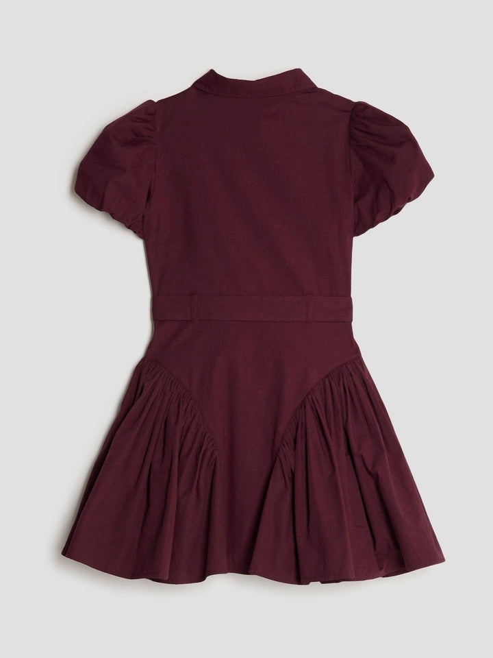 Shirt dress Collared Belt loops Belted Frilled Buttoned fastening Puff short sleeves Machine washable. 100% Cotton. Country of Origin: India