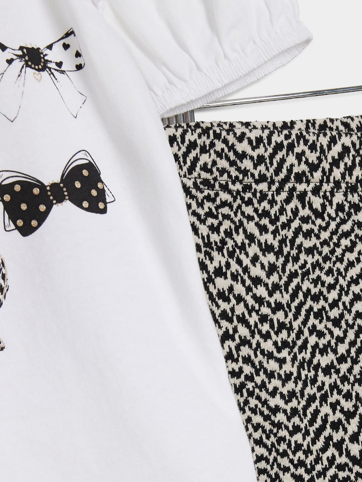 2-piece outfit T-Shirt: Crew neck Bow graphic print Short puffed sleeves Textured leggings Elasticated waist 100% Cotton. Country of Origin: Great Britain