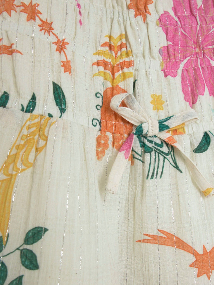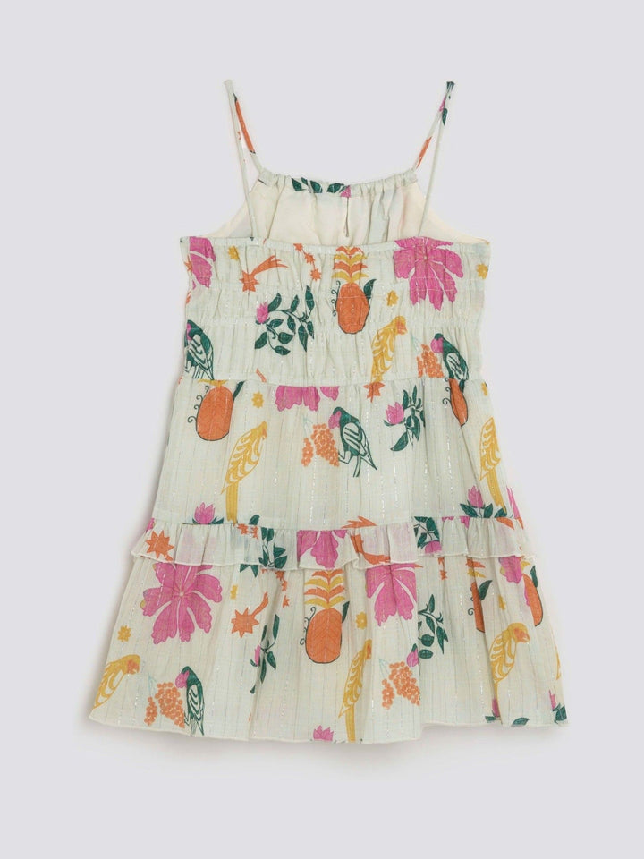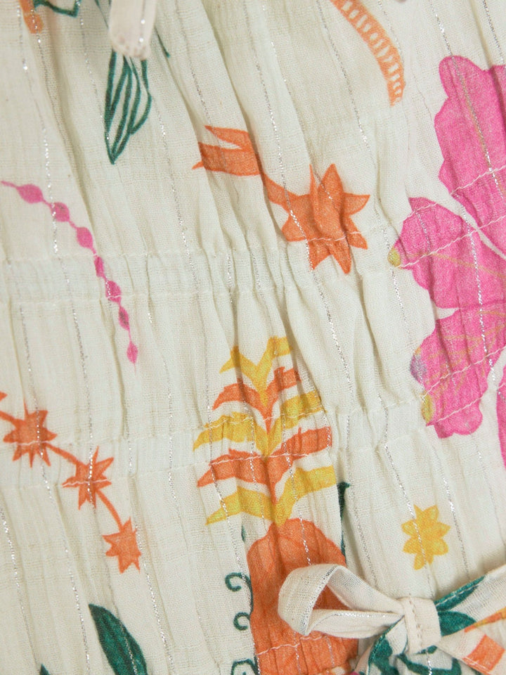 Square neckline Strapped Floral print Bow detail Embroidered stripe Frilled Sleeveless Mini length Machine washable. 97% Cotton, 3% Metallised fibre. Country of Origin: Great Britain