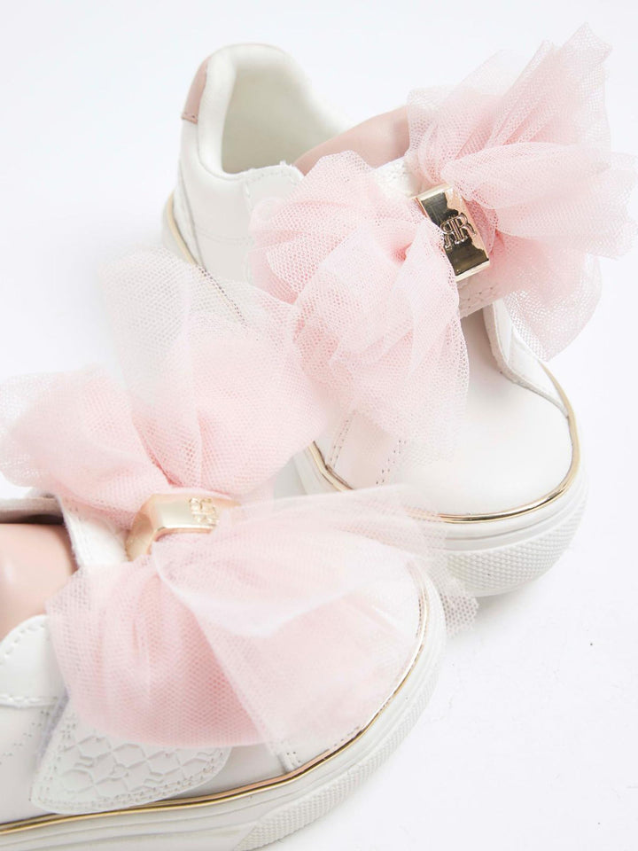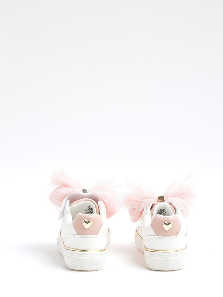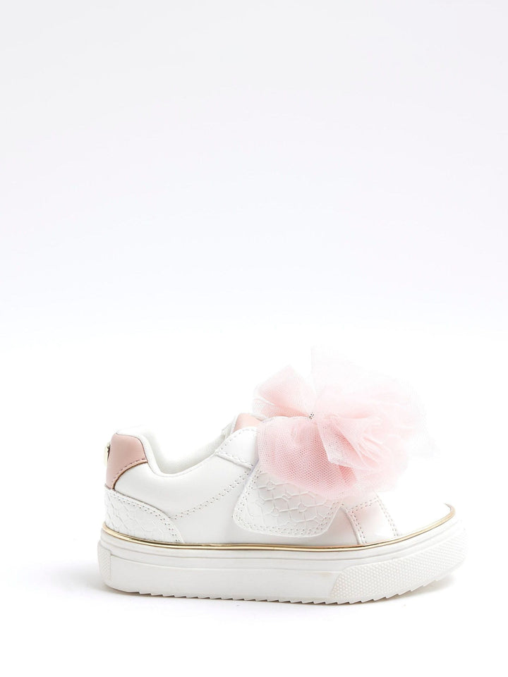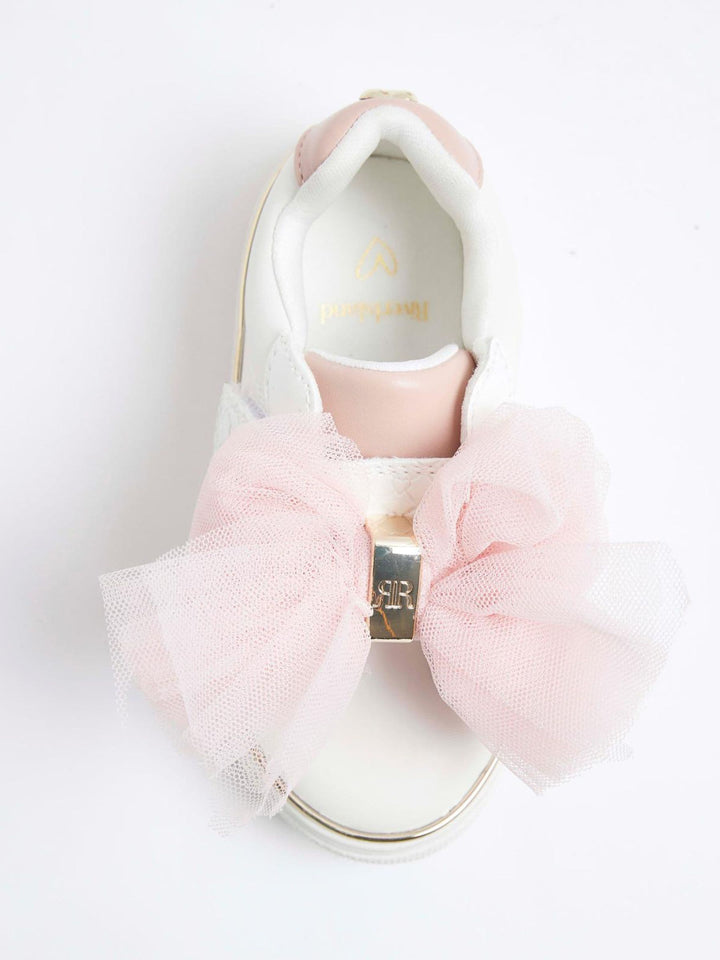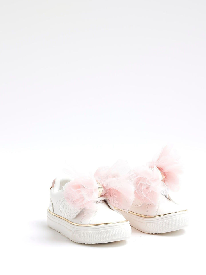 Faux leather fabric, round toe, touch-and-close fastening strap, bow detail, slip-on design, flat soles. 100% PU. Country of Origin: China
