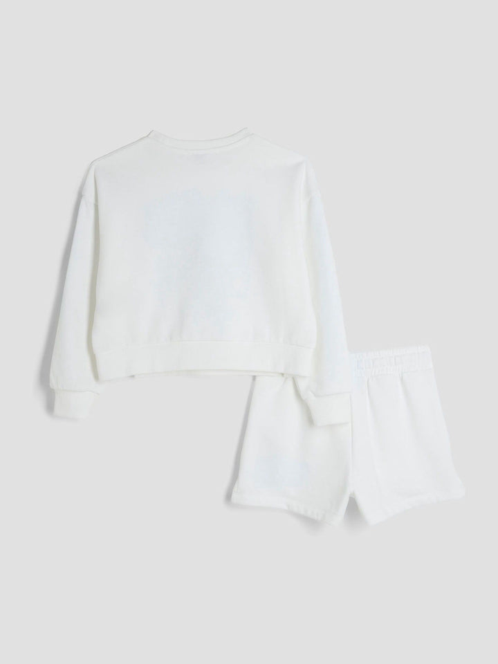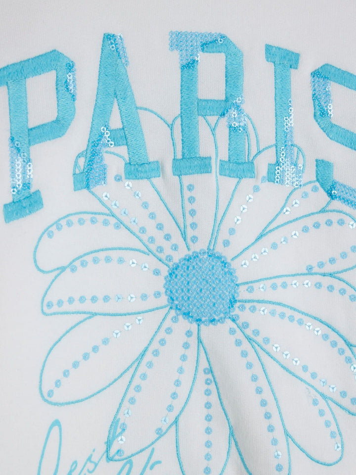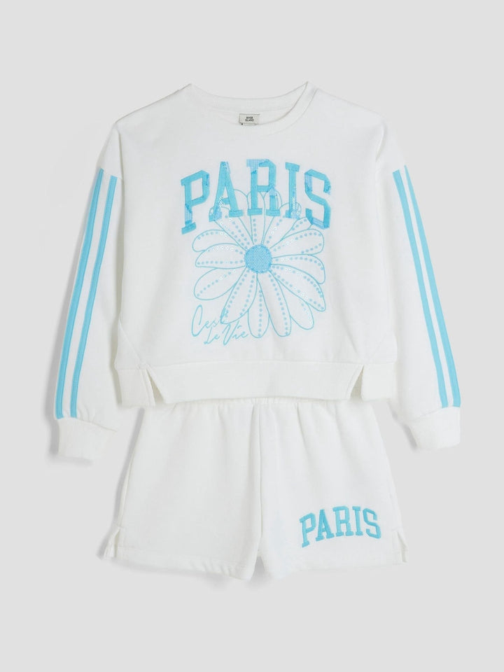 2 piece set Sweatshirt and shorts Crew neckline Long sleeves Embroidered Paris graphic Sequin embellishment Elasticated drawstring waistband Washable. 60% Cotton, 40% Polyester. Country of Origin: Sri Lanka