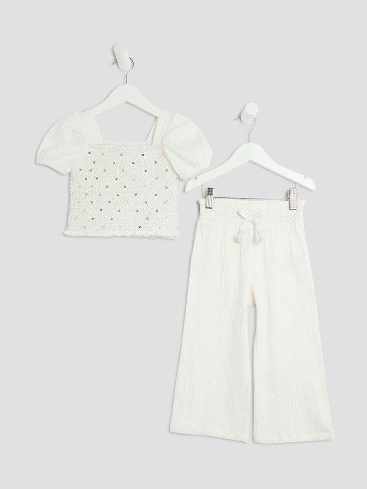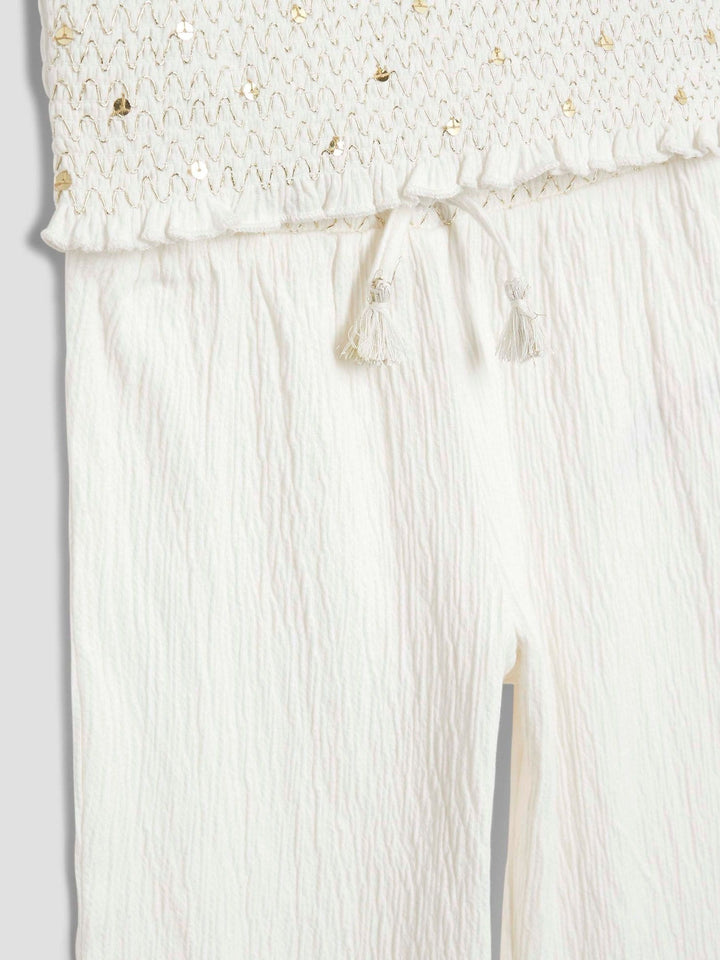 Set of 2 Top: Square neckline Sequin style Shirred Short sleeves Lightweight Trousers: Side slip pockets Elasticated drawstring waist Machine washable. 95% Cotton, 4% Polyester, 1% Elastane. Country of Origin: India