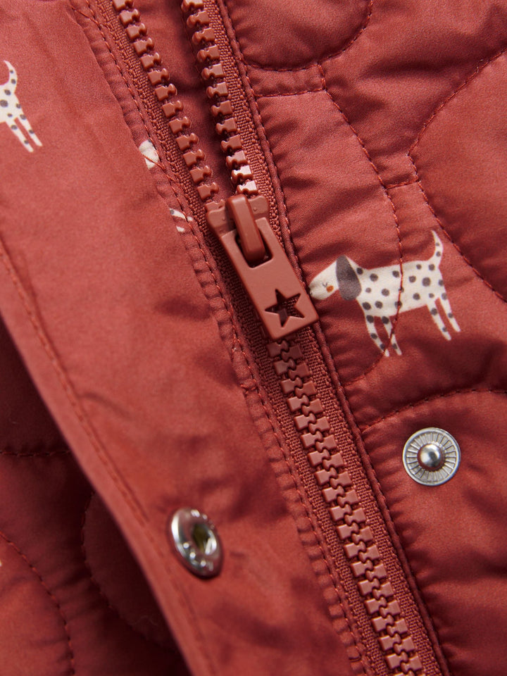A perfect choice for her adventures, this coat is designed for both style and protection. The shower resistant outer and cosy faux fur lining ensure she stays warm and dry, while the unique heart quilt design and playful dog print add a charming touch. Shower resistant Heart quilt design Faux fur lining Fleece lined pockets Machine washable. Main 100% Recycled polyester. Lining 100% Recycled polyester. Wadding 100% Recycled polyester. Country of Origin: Myanmar