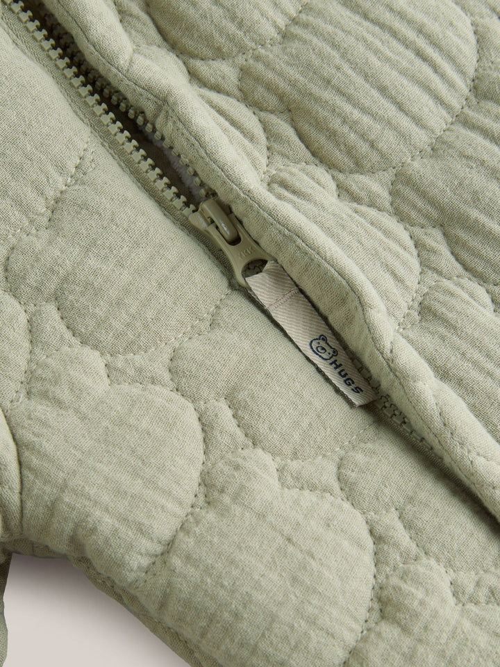 This cosy and stylish pramsuit is made from a soft crinkle-effect cotton fabric with stitched all-over quilting and a double zip fastening for easy wear. A borg fleece lining keeps them warm, with a set-in hood and elasticated sleeve cuffs. Double zip fastening Borg fleece lining Quilted Crinkle cotton outer Hooded Main 100% Cotton. Lining 100% Recycled polyester. Wadding 100% Recycled polyester. Country of Origin: China Warning: Keep away from fire and flames.