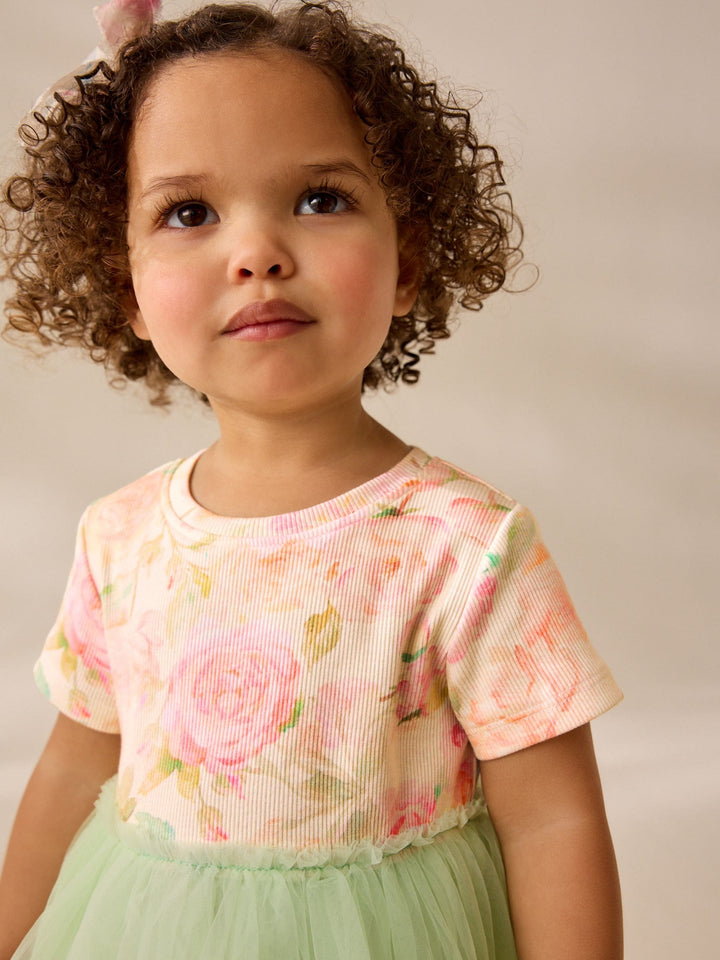 Think pink for her next party with this rainbow pink party dress. The top is made from a cotton rich blend and features a fun wave rainbow design and the skirt is made from a mesh fabric with a full skirt and lining. Pair with sandals or trainers for a complete look Wave rainbow design Cotton rich blend Mesh skirt Fully lined Short sleeves Machine washable. Main 95% Cotton, 5% Elastane. Mesh 100% Nylon. Lining 100% Cotton. Country of Origin: Bangladesh