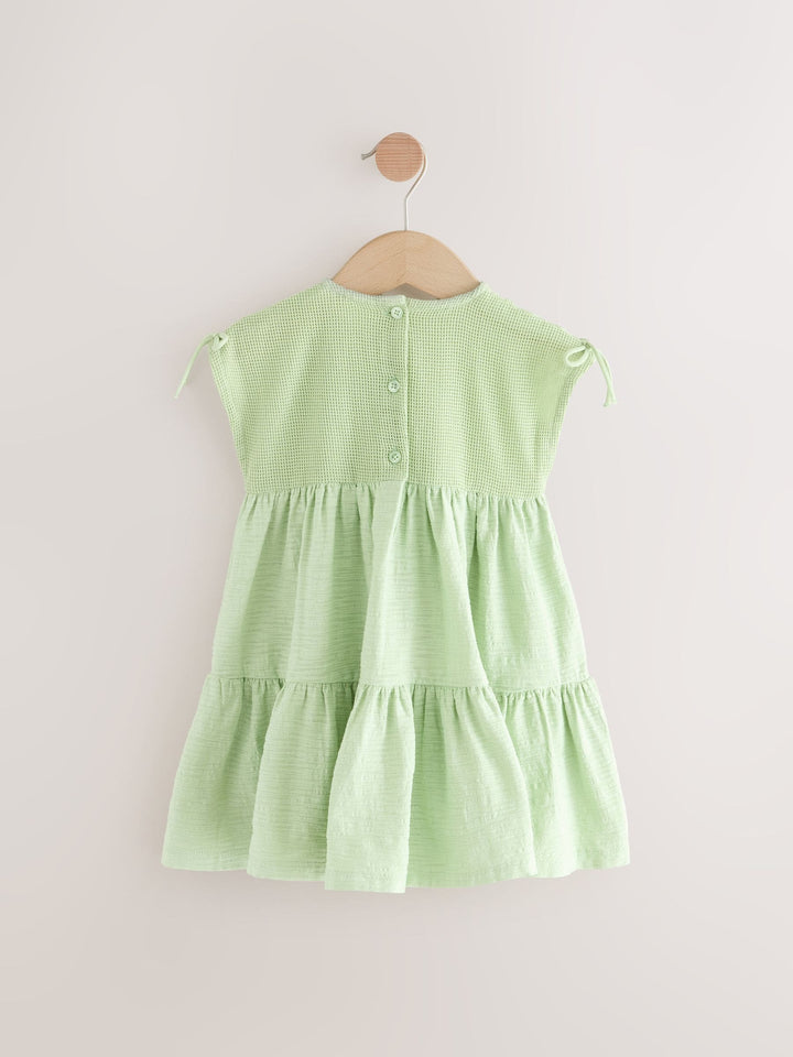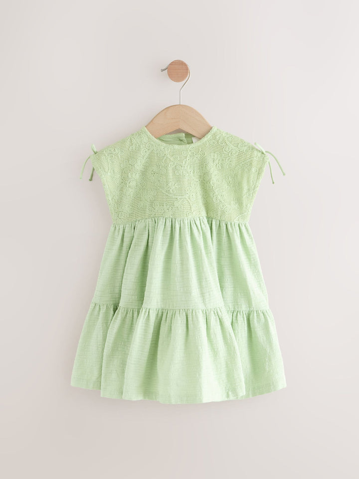 Update her warm weather wardrobe with our sleeveless lace dress. Designed with a lace detail front, textured tiered hem and button back opening for easy dressing. Sleeveless dress Lace detail Button back Machine washable. Main 98% Cotton, 2% Elastane. Yoke 100% Cotton. Lining 100% Cotton. Country of Origin: India