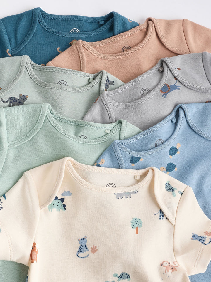 Keep them well stocked with a bodysuit for every day of the week, with this 7-pack bodysuit set featuring a pure cotton construction, a selection of adorable animal mini-prints, an envelope neck opening and a popper bottom fastening for easy changing. 7-pack 100% cotton Envelope neck opening Popper bottom fastening Machine washable. 7 x Bodysuit 100% Cotton. Country of Origin: Bangladesh Warning: Keep away from fire and flames.