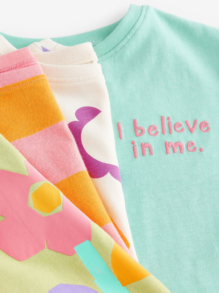This 4-pack of t-shirts feature fun floral, striped and embroidered designs, made from pure cotton with woven sleeve tabs and crewneck collars. 4-pack 100% cotton Fun and bright prints Crewneck collar Machine washable. 4 x T-shirt 100% Cotton. Country of Origin: Bangladesh
