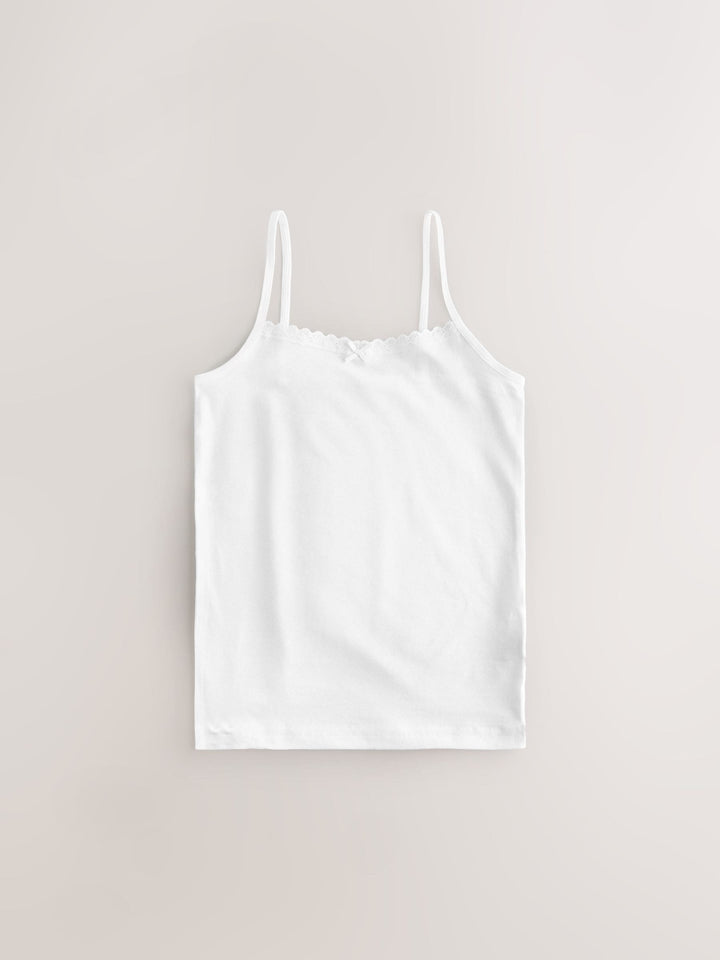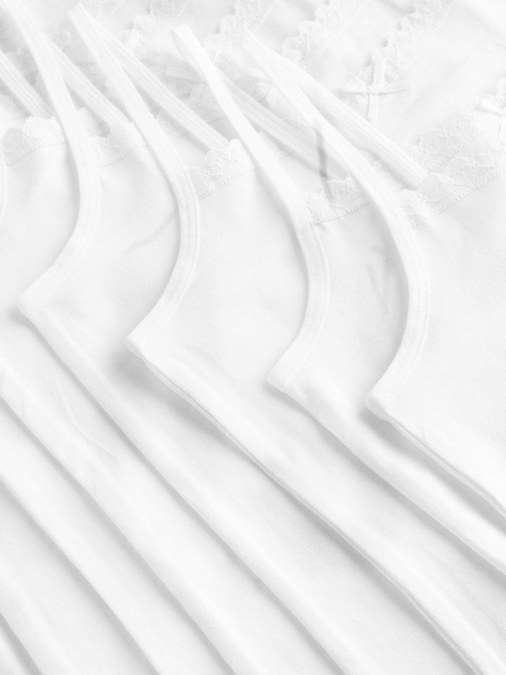Our strappy 10-pack of Cami vests are made from a cotton-rich fabric with added stretch, decorated with lace trim detailing and a bow. 10 pack Cotton-rich fabric Thin shoulder straps Lace detailing Machine washable. 10 x Vest 95% Cotton, 5% LYCRA® XTRA LIFE™ elastane. Country of Origin: Bangladesh LYCRA® XTRA LIFE™ fibre keeps your underwear looking new for longer, with lasting comfort and fit. This innovative stretch fabric is lightweight and breathable and will hold its shape wear after wear, wash after wash.