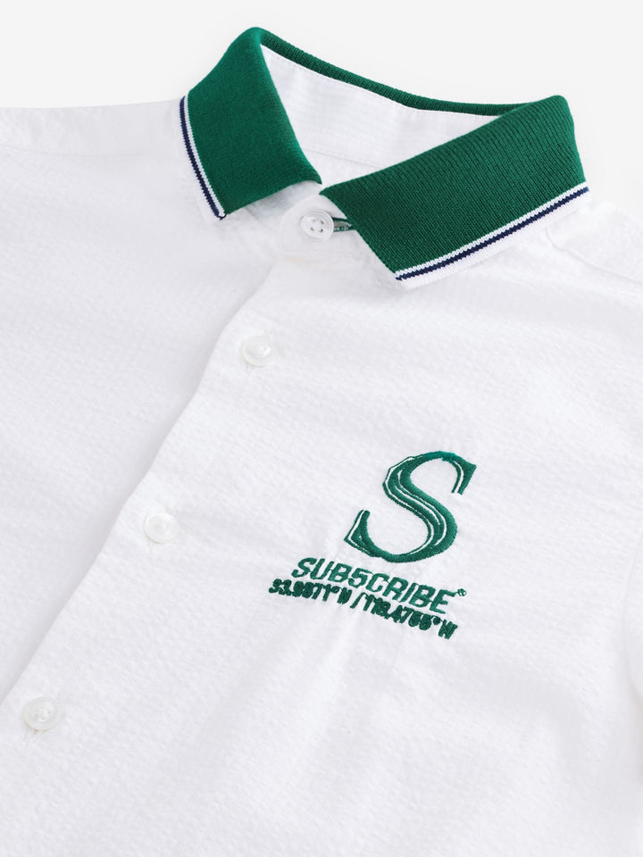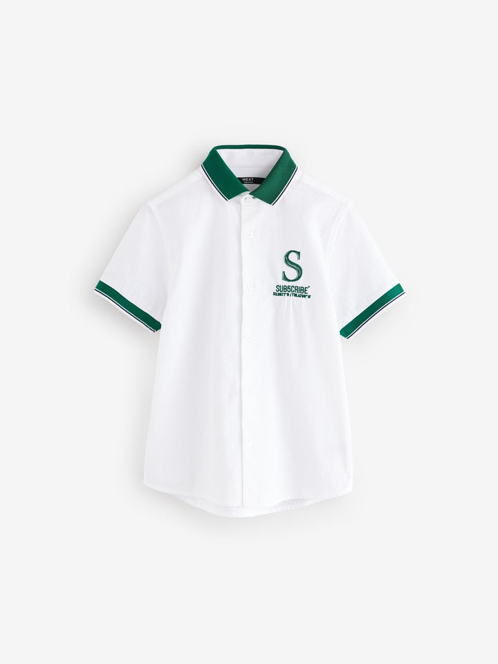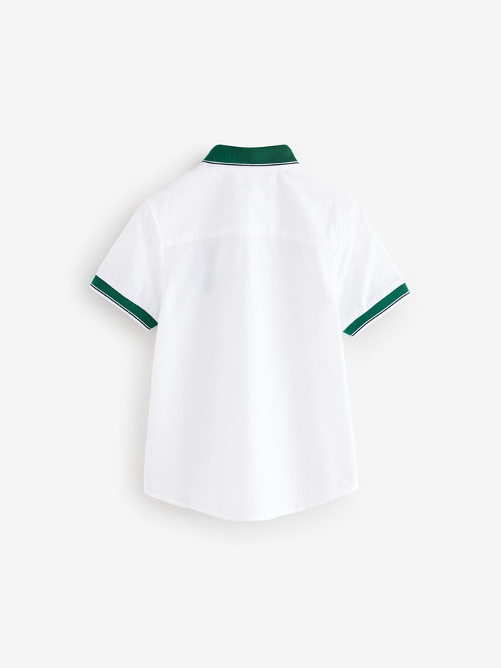 This short sleeve shirt is made from pure cotton in a seersucket texture, with a button-up fastening, an embroidered chest design and contrasting green sleeve trims and collar. 100% cotton Button-up fastening Embroidered chest motif Green contrast detailing 100% Cotton. Country of Origin: India
