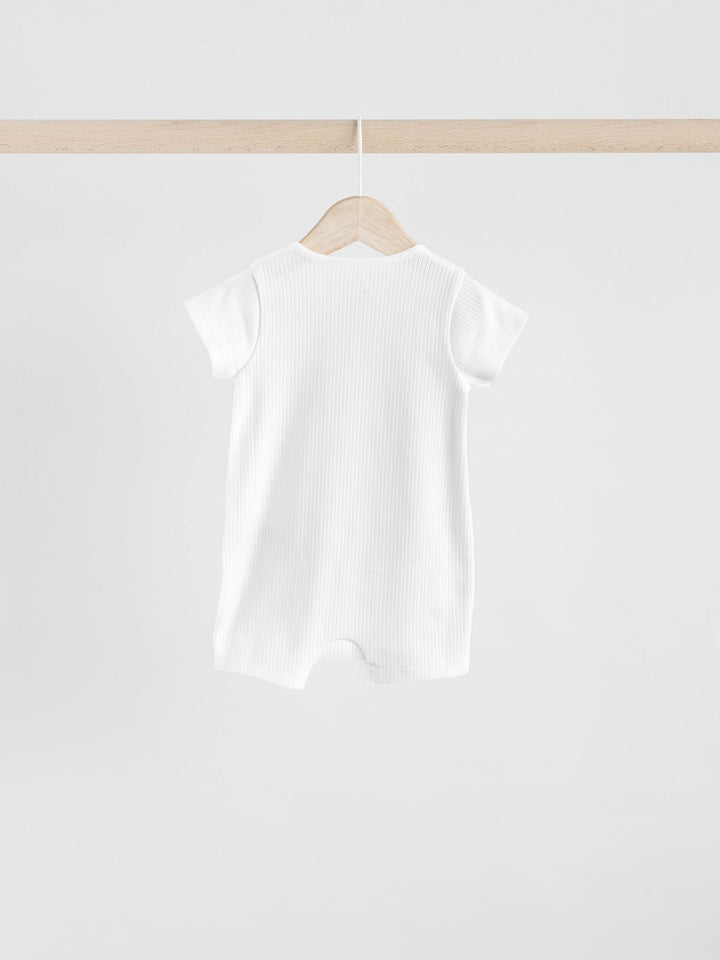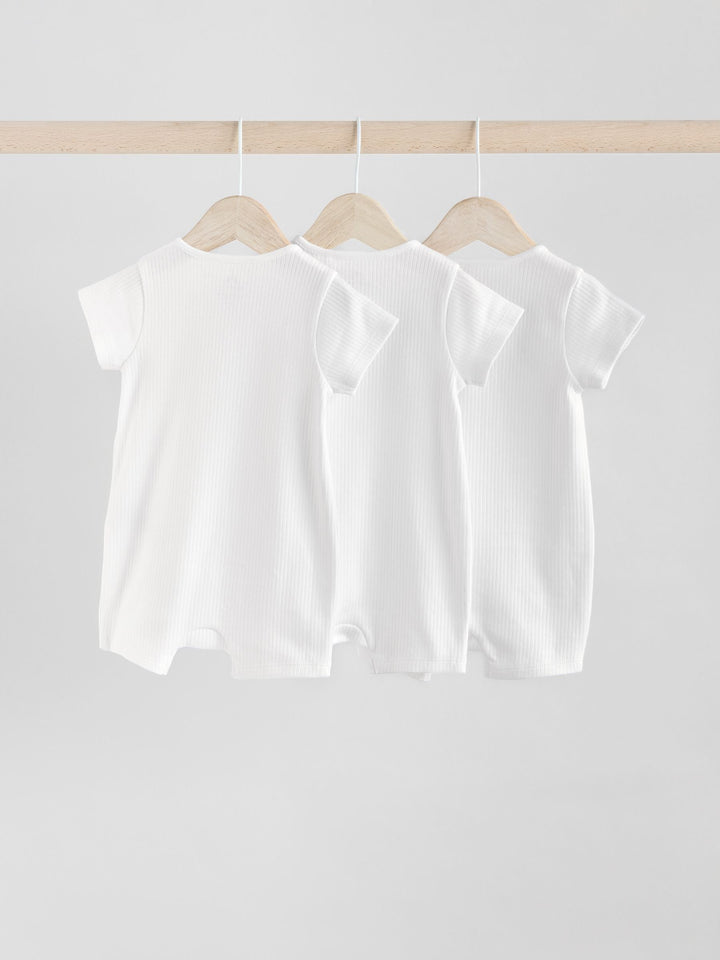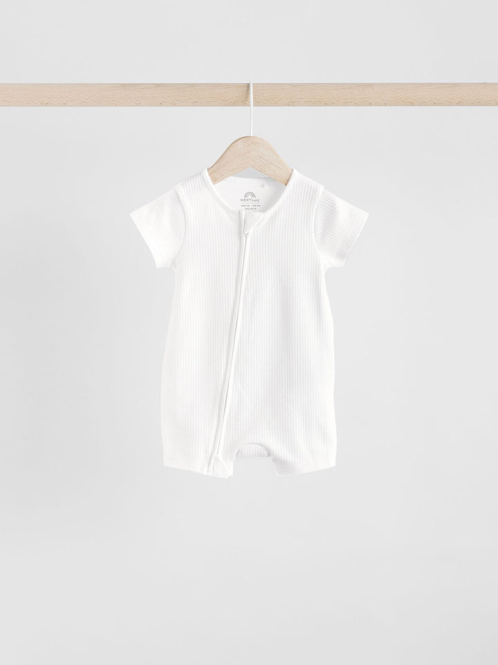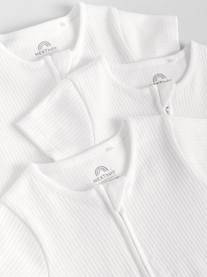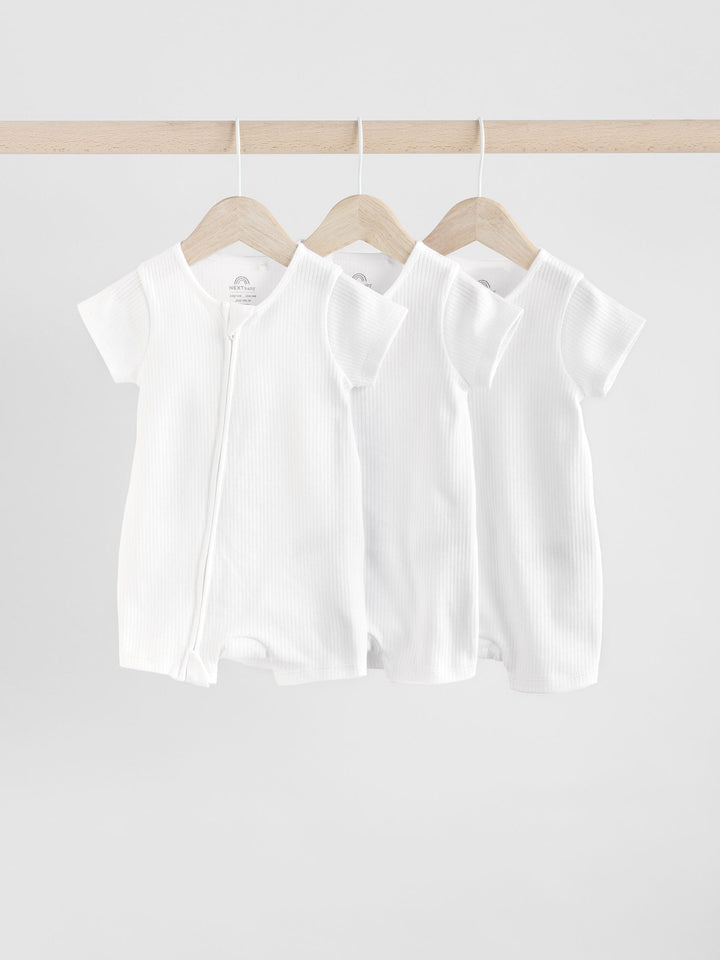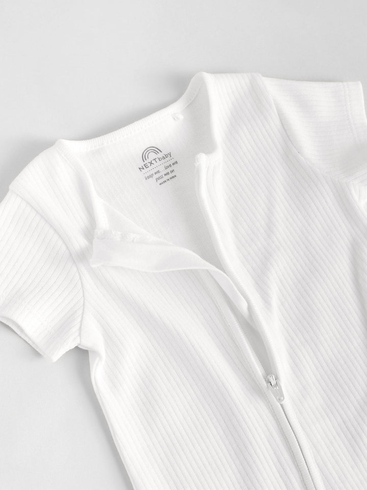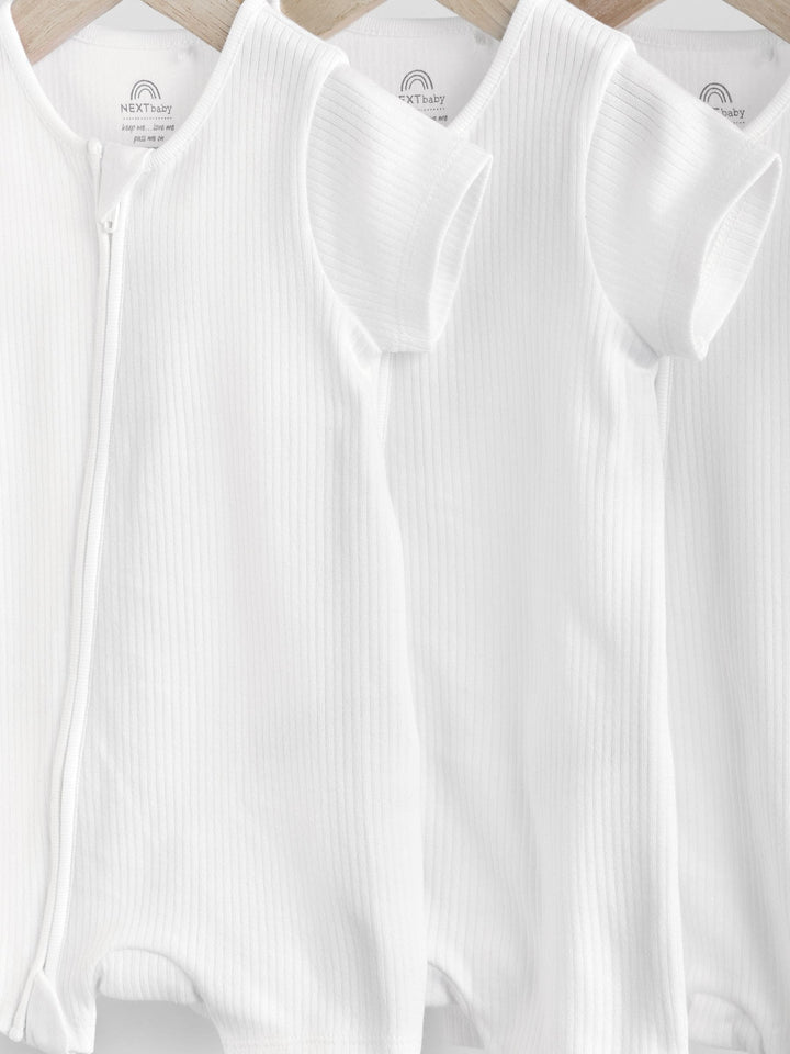 This 3-pack of white sleepsuits are made from a comfortable cotton fabric that's soft on their skin, with a two-way zip fastening for easy wear, short sleeves and a ribbed textured, finished with a round collar. Pack of 3 Two-way zip Full-length zip for easy changing Supersoft cotton rib Machine washable. 3 x Sleepsuit 100% Cotton. Country of Origin: India Warning: Keep away from fire and flames.
