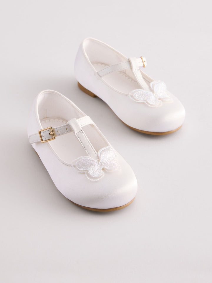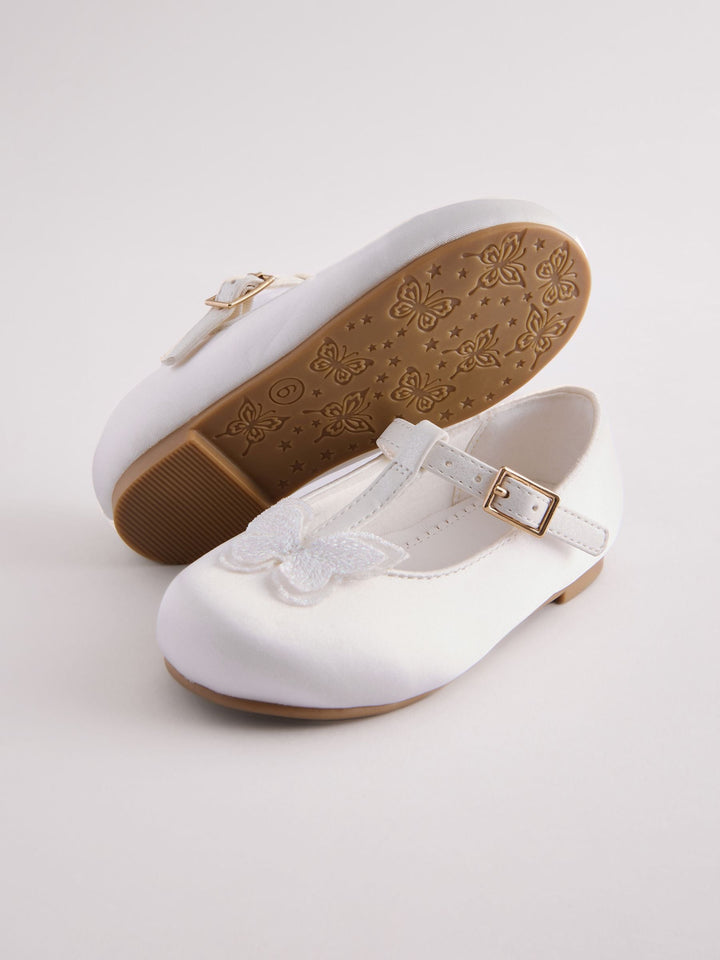 Whether it's a wedding or a family party, these gorgeous white shoes have a T-bar strap with butterfly detailing in a faux leather, against a smooth and stain-resistant satin upper, with a textile lining and a slip-resistant and durable outsole. Satin upper Faux leather T-bar Butterfly detailing Textile lining Slip-resistant durable outsole Upper - Textile, Other Materials, Lining & Sock - Textile, Other Materials, Sole - Other Materials. Country of Origin: China