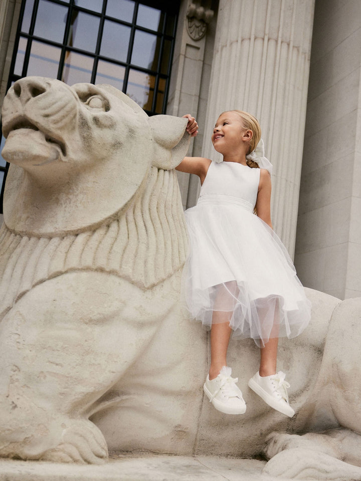 She'll be the best dressed flower girl in our bridesmaid white dress. This stunning frock is cut in a midi length and features a delicate tulle skirt made for twirling and dancing. Fully lined with button fastening down the back, this gorgeous number is complete with a beautiful bow to make her the belle of the ball. Tulle skirt Midi length Fully lined Bow detailing Main 100% Recycled polyester. Lining 100% Cotton. Net 100% Recycled Nylon. Country of Origin: China