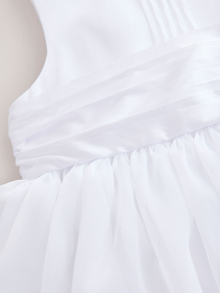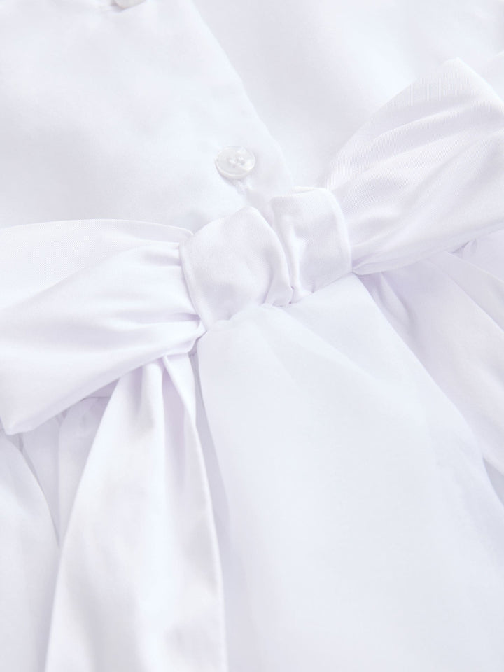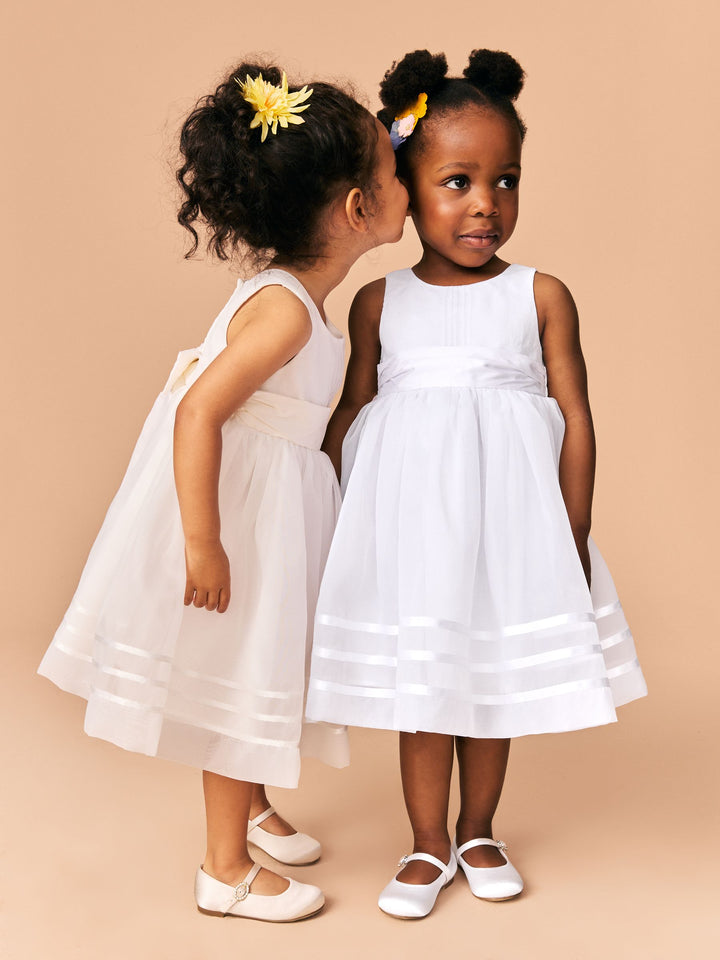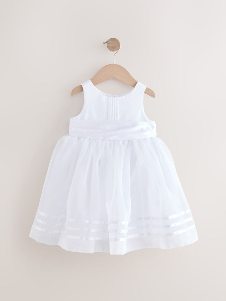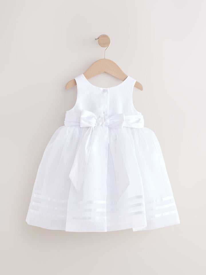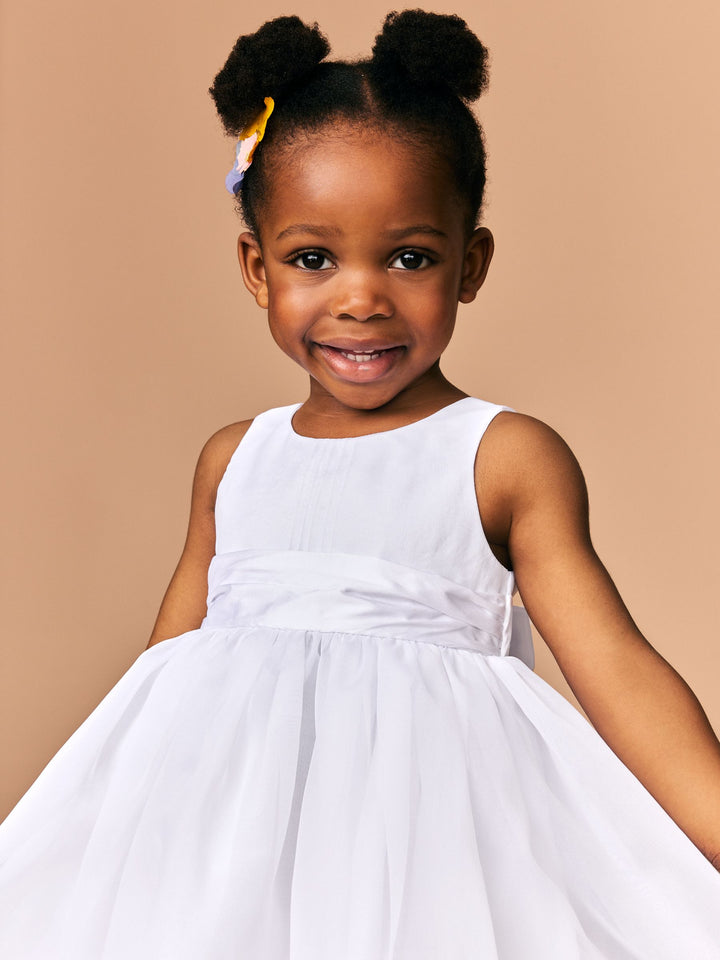 Get her ready for an important job on the big day, with this white flower girl organza dress. The dress features 3D bow detailing to the back with a sash trim detailing, with a round collar and a button-up fastening to the back, finished with a comfortable cotton-blend jersey lining. Round collar Button fastening 3D bow detailing Sash trim detail Cotton-blend jersey lining Main 100% Polyester. Lining 65% Polyester, 35% Cotton. Trim 100% Polyester. Country of Origin: Morocco
