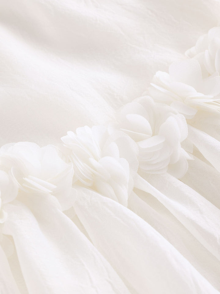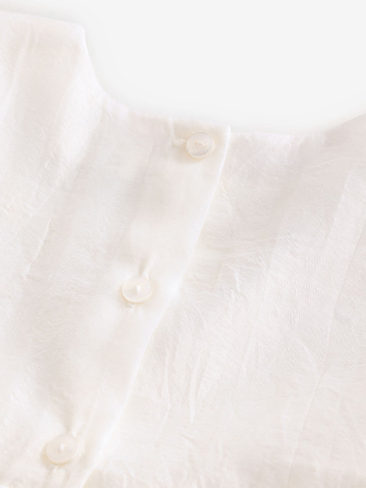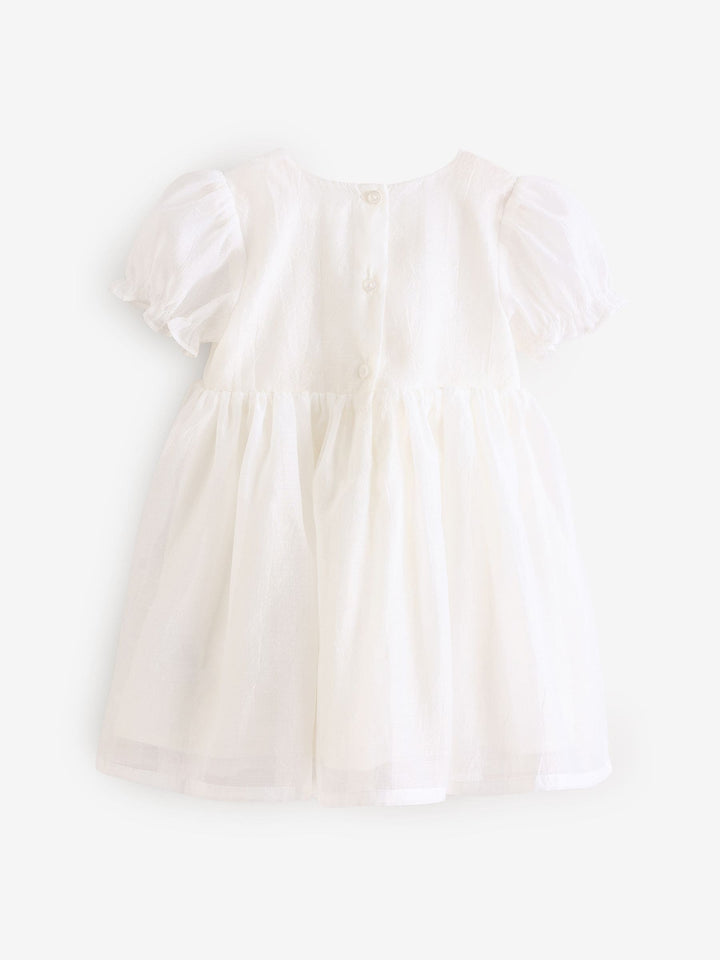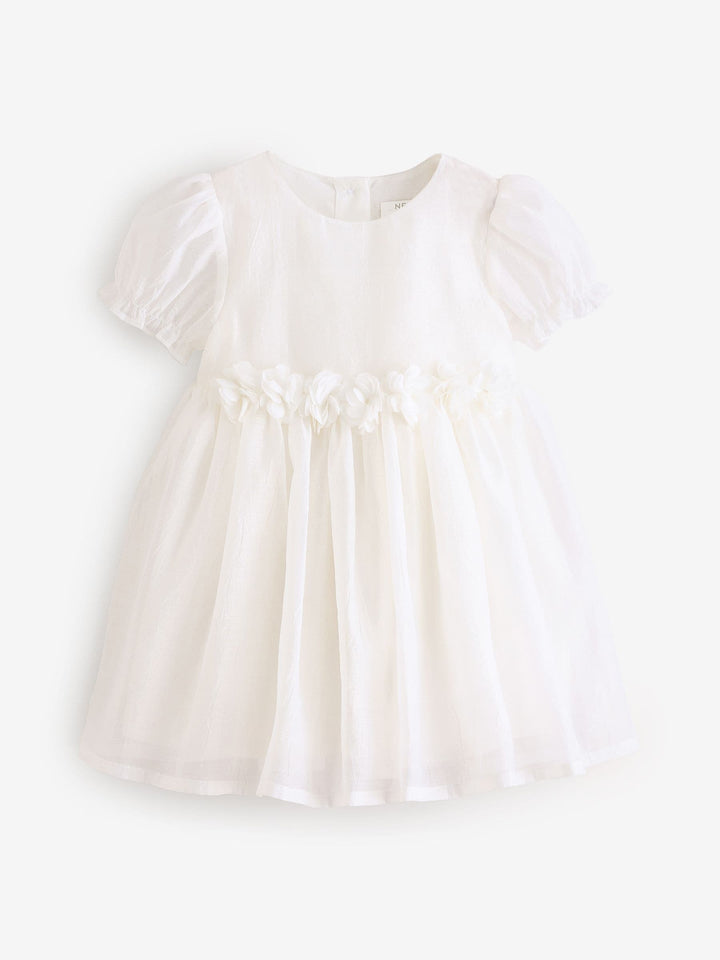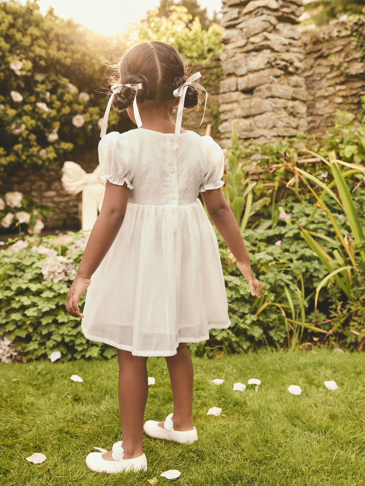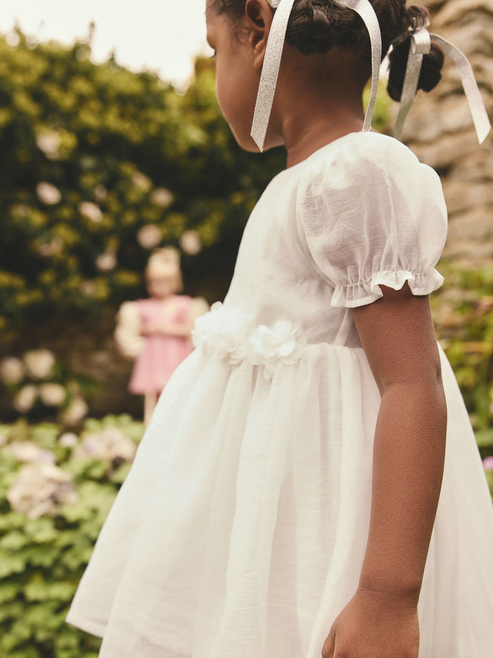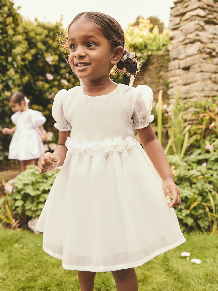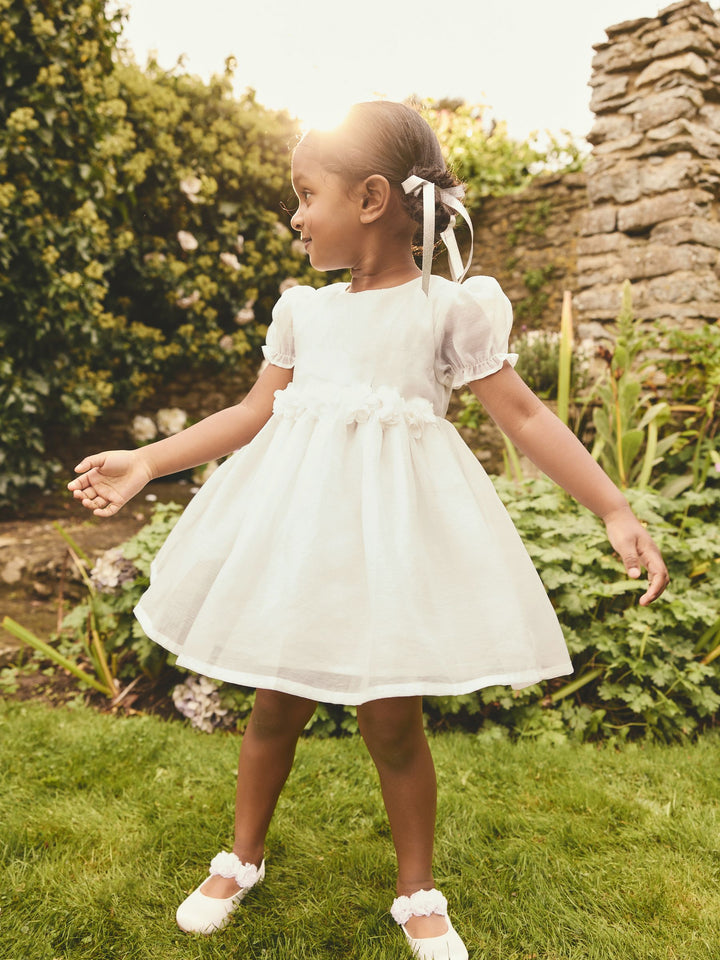 Get her ready for an important job on the big day, with this beautiful white flower girl dress. Made from a soft organza fabric with a cotton lining, the dress features delicate corsage detailing, short puff sleeves and a button fastening to the back. Soft fabric Cotton lining Corsage detailing Button fastening Short puff sleeves Main 100% Recycled polyester. Lining 100% Cotton. Country of Origin: China