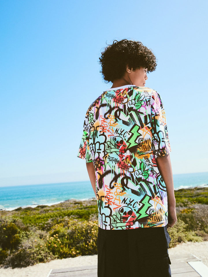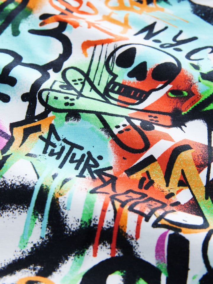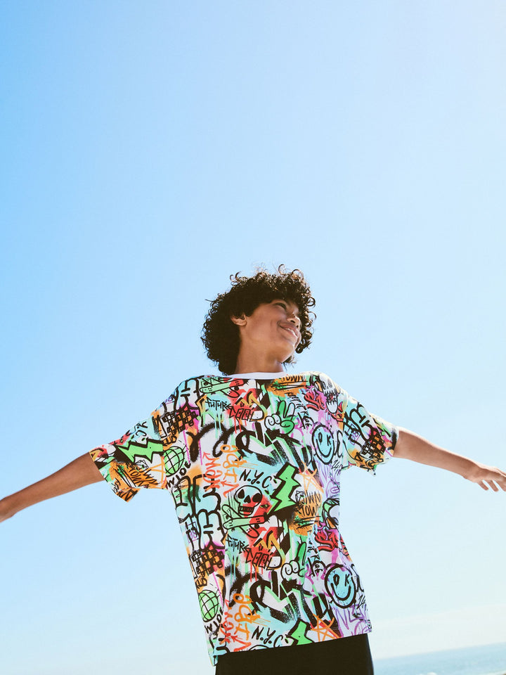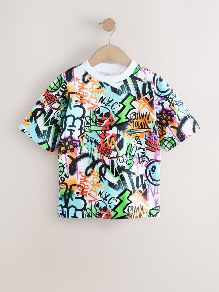 Add to their cool kid style with our relaxed fit white and multi-coloured graffiti short sleeve t-shirt. With an eye-catching design and comfortable relaxed fit, they'll look as cool as they feel. 100% cotton Graphic print t-shirt Relaxed fit Short sleeves Comfortable fabric Machine washable. 100% Cotton. Country of Origin: Bangladesh