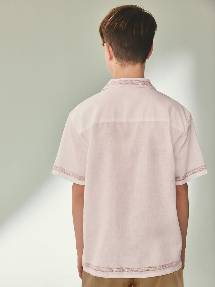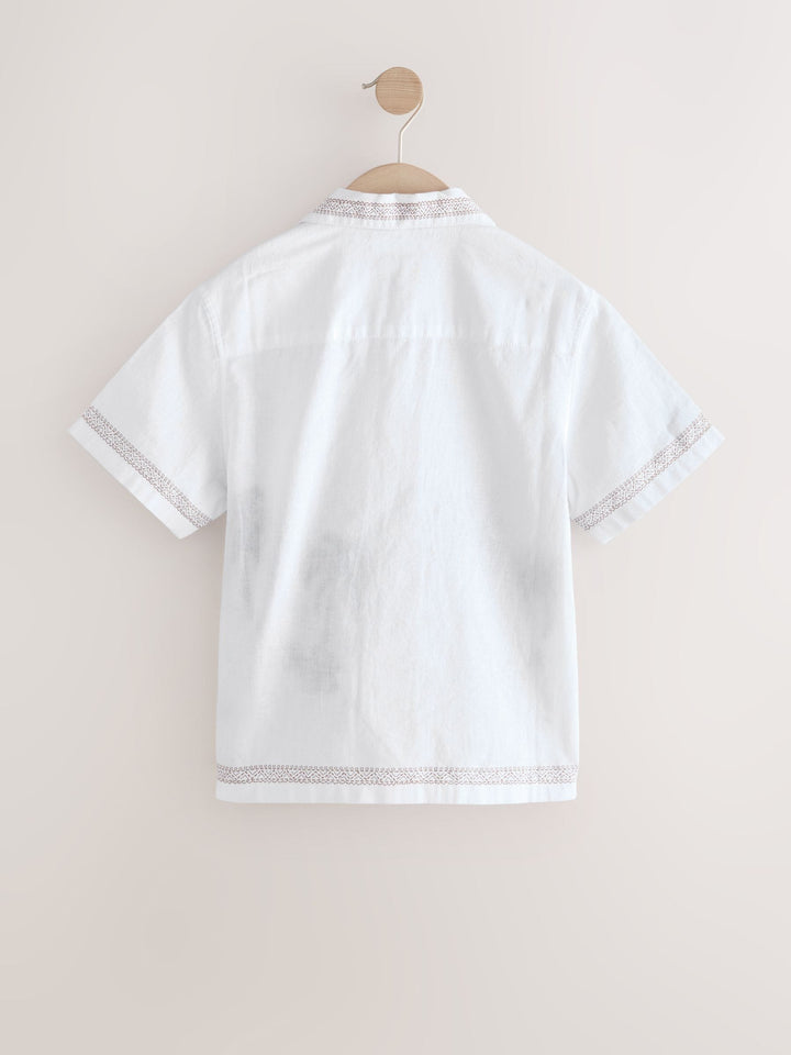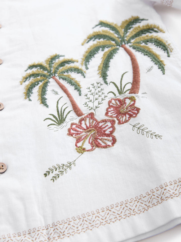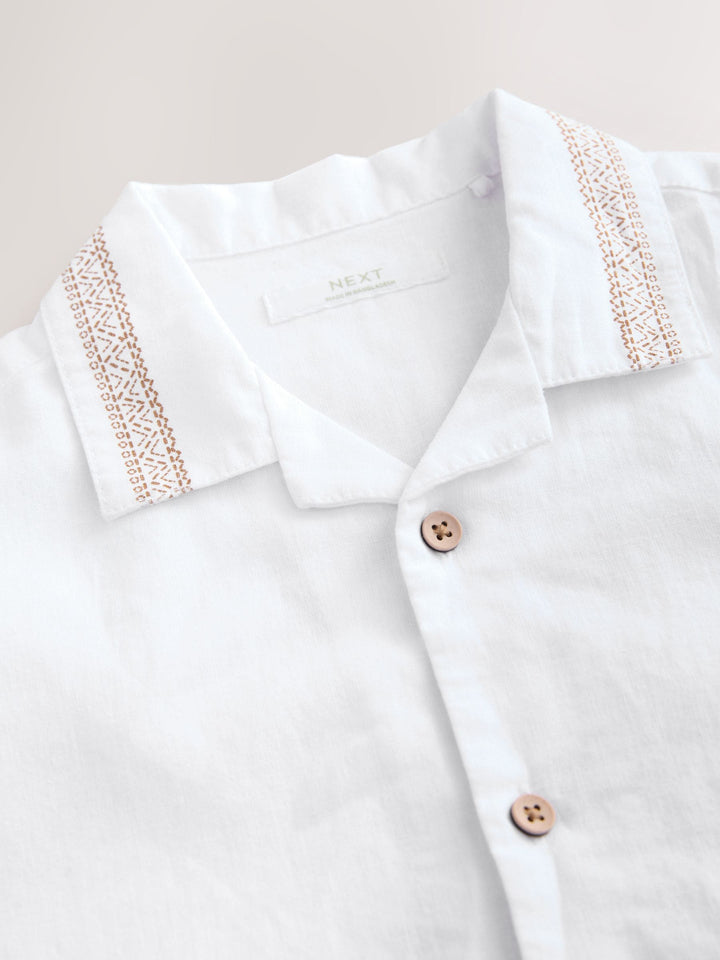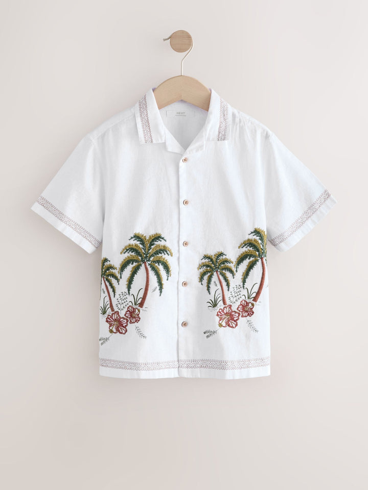 With a cotton and linen blend fabric for a breathable summer feel, this white short sleeve shirt has a smart-casual look, featuring a button-down fastening with a revere collar and embroidered palm trees. Cotton and linen fabric Button-down fastening Revere collar Short sleeves 55% Linen, 45% Cotton. Country of Origin: Bangladesh