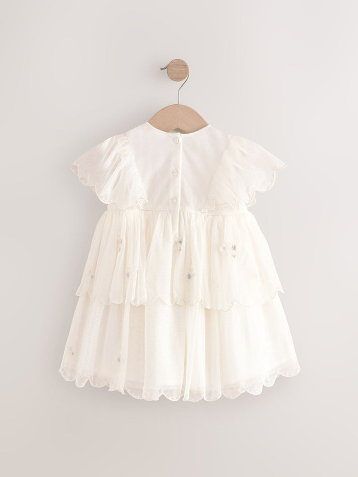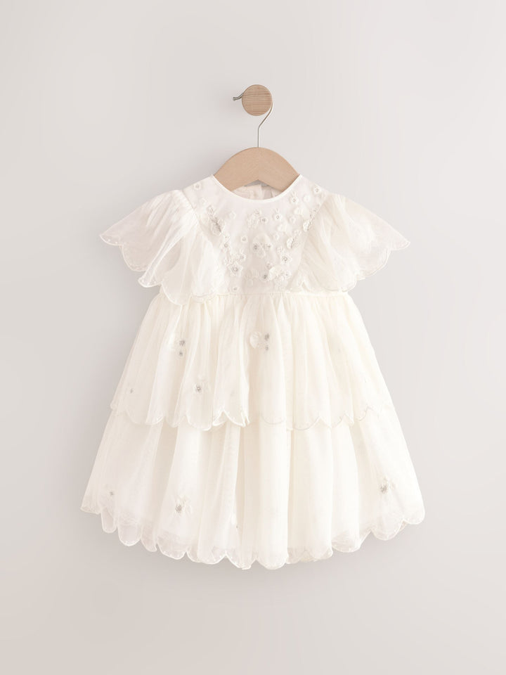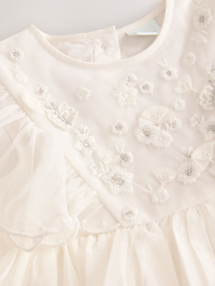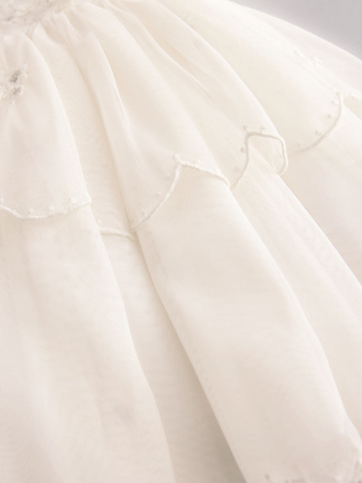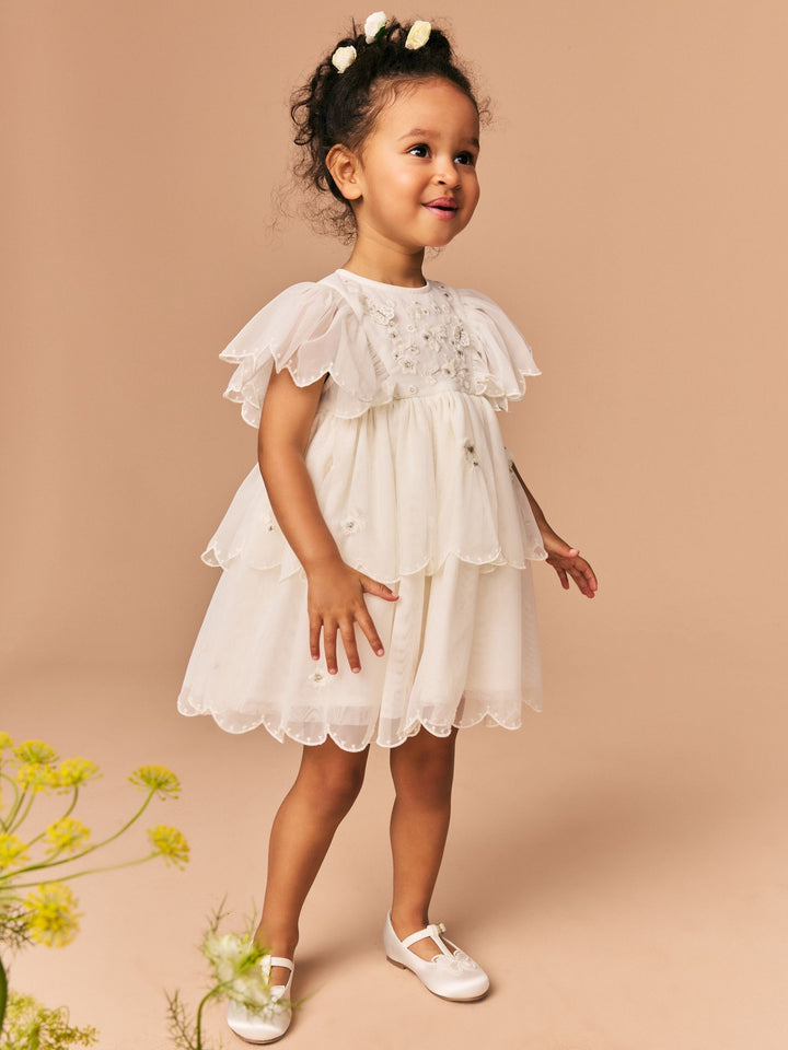 Perfect for weddings, birthday parties and more, this gorgeous white dress features a mesh fabric with floral embroidery, tiered skirting and ruffle short sleeves, finished with a button-up fastening to the back and a cotton lining. Mesh fabric Embroidered design Tiered skirting Ruffle short sleeves Button-up fastening Cotton lining Machine washable. Main 100% Recycled polyester. Lining 100% Cotton. Country of Origin: India