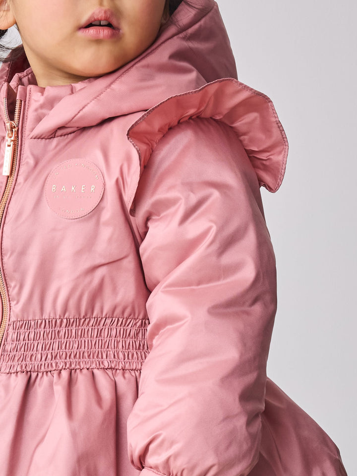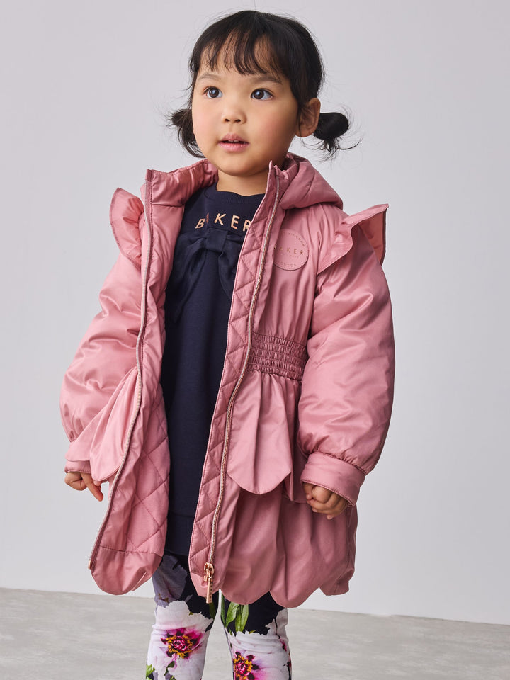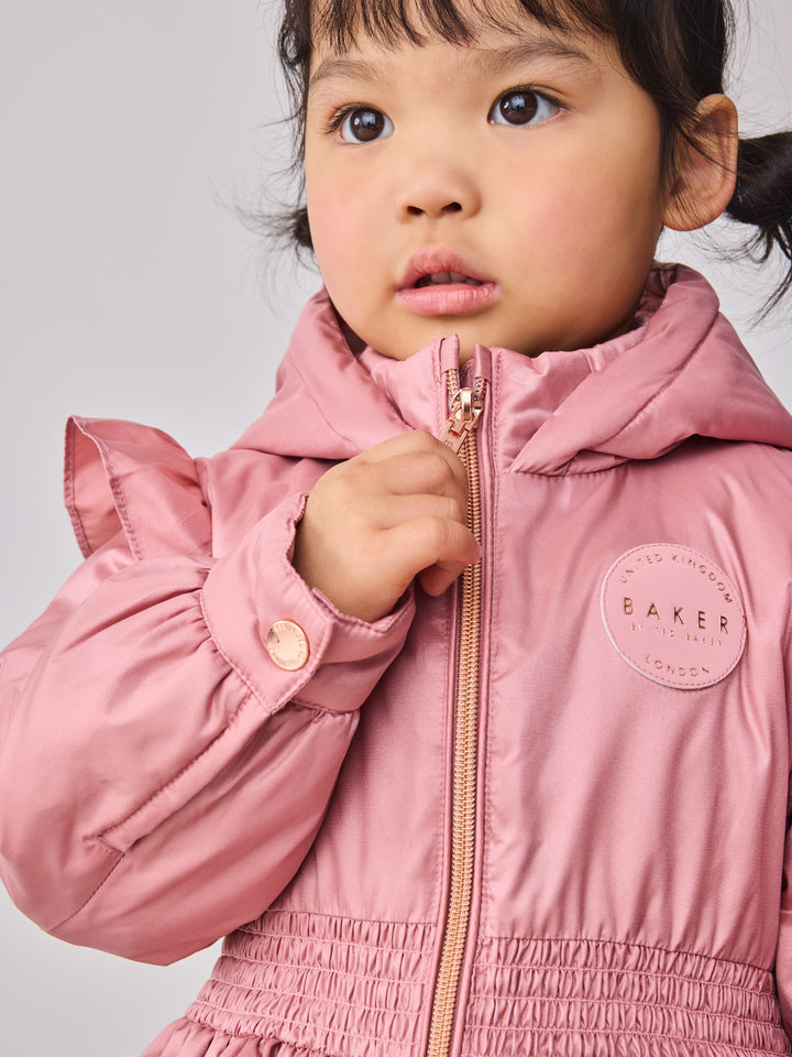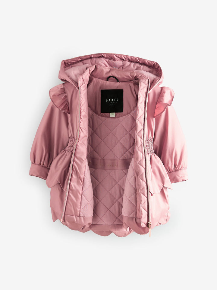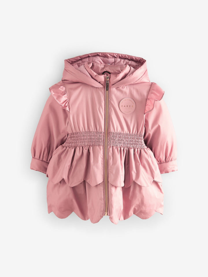 Banish those rainy days in style with this fashionable and functional rain coat from Baker by Ted Baker. The shiny pink raincoat cuts a stunning silhouette with a layered scallop style hem, frilled details on the shoulders and a ruched waist for a comfortable fit. The raincoat boasts beautiful rose gold hardware including both zip and popper fastenings, with printed rose gold branding on the hood and a branded Baker badge at the chest. Perfectly lightweight yet effective against the shower season. Shower resistant Scallop hem Rose gold branded hardware Shell 100% Nylon. Body Lining 100% Cotton. Sleeve Lining 100% Polyester. Wadding 100% Polyester. Country of Origin: China Shower resistant, water repellent finish to provide protection against light rain.