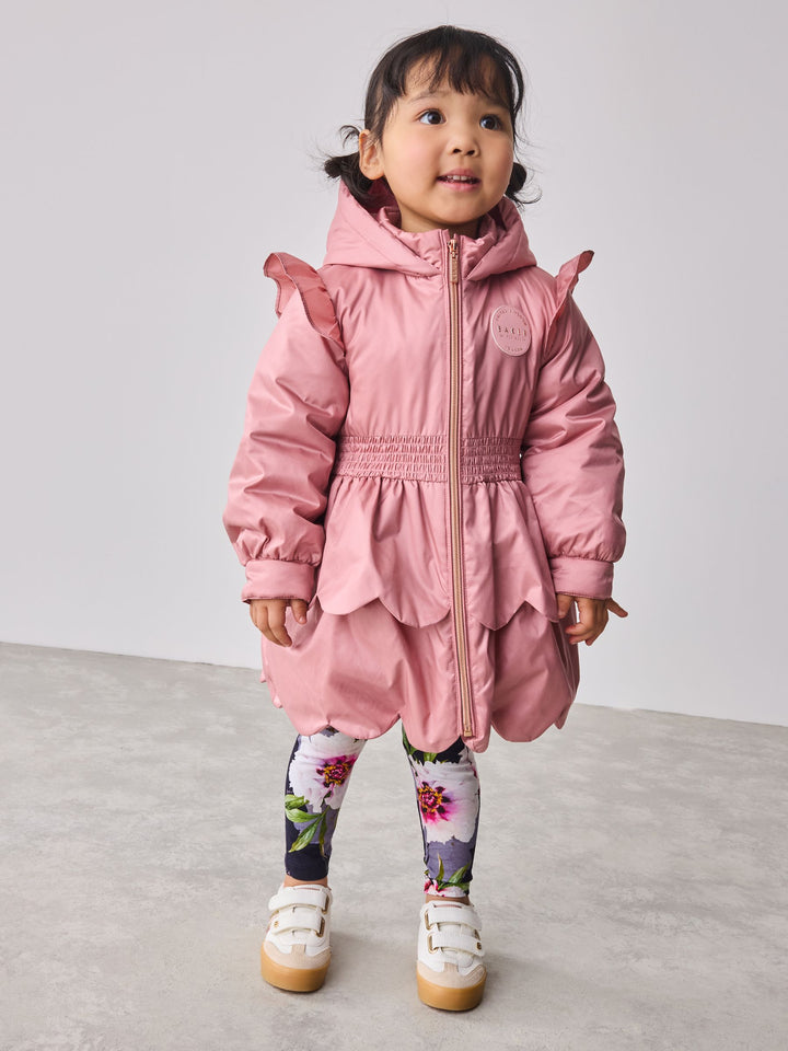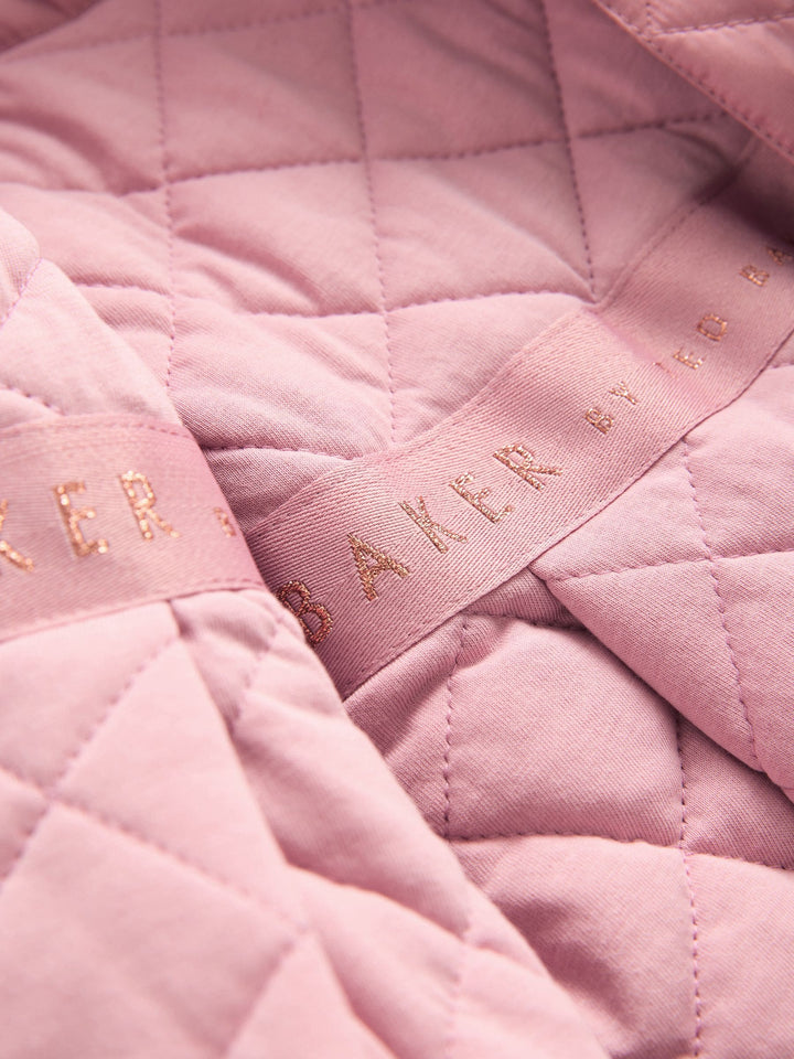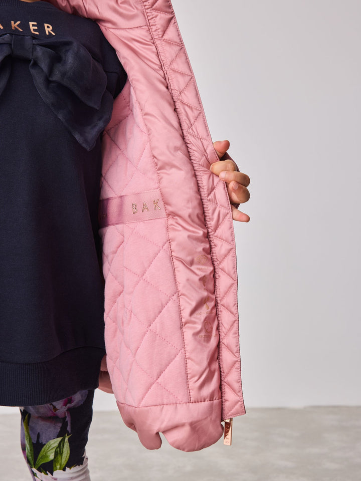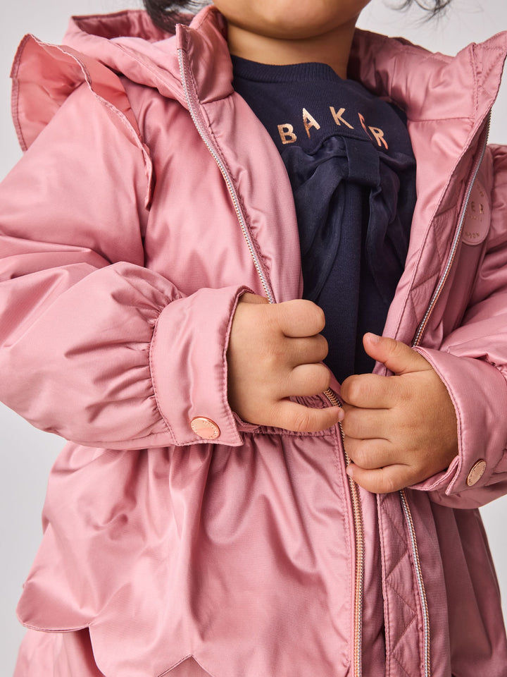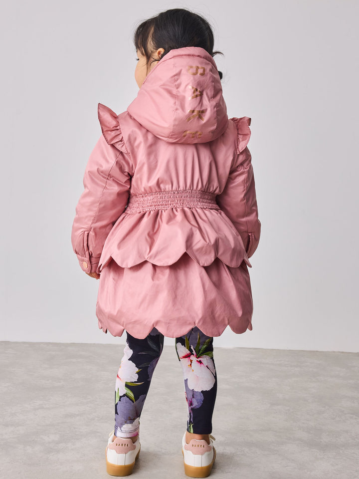 Banish those rainy days in style with this fashionable and functional rain coat from Baker by Ted Baker. The shiny pink raincoat cuts a stunning silhouette with a layered scallop style hem, frilled details on the shoulders and a ruched waist for a comfortable fit. The raincoat boasts beautiful rose gold hardware including both zip and popper fastenings, with printed rose gold branding on the hood and a branded Baker badge at the chest. Perfectly lightweight yet effective against the shower season. Shower resistant Scallop hem Rose gold branded hardware Shell 100% Nylon. Body Lining 100% Cotton. Sleeve Lining 100% Polyester. Wadding 100% Polyester. Country of Origin: China Shower resistant, water repellent finish to provide protection against light rain.