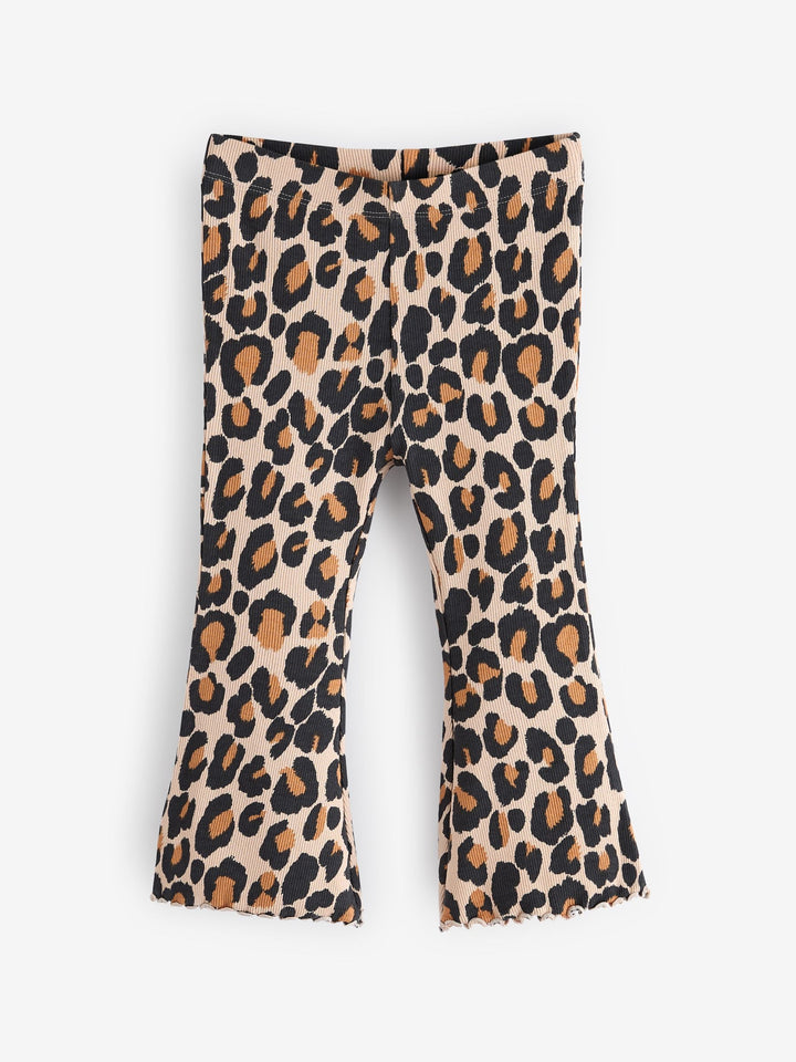 Level-up her everyday looks with our leopard print rib flare leggings. Made from a cotton rich blend for added comfort and finely finished with lettuce trim edges, an elasticated waistband amd ribbed detailing. Ribbed cotton stretch fabric Elasticated waistband Pull-On style Wide-leg shape Lettuce trim edges Machine washable. 95% Cotton, 5% Elastane. Country of Origin: Bangladesh