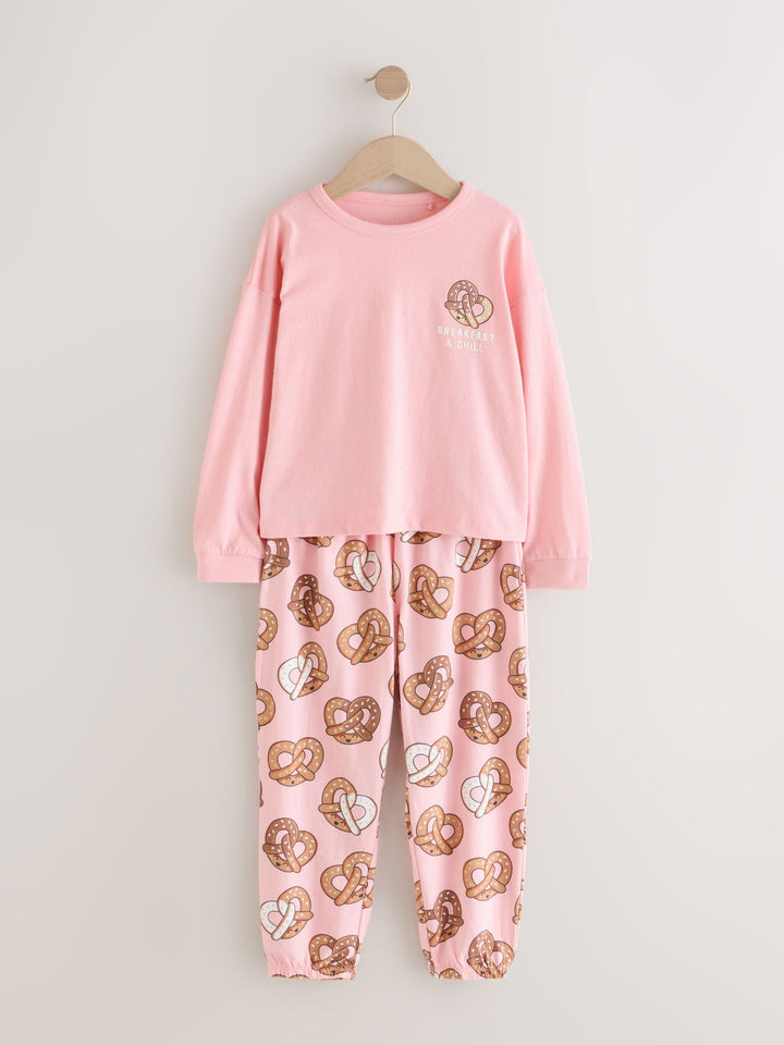 Make her bedtime fun and bright with this 3 pack of joggers pyjamas. The soft fabric and comfortable fit ensure a snug feel for all-night wear. The pack includes three different sets in vibrant colours and prints, and have elasticated waistband. Embroidered details Short-sleeved tops Matching joggers Vibrant colours and prints 3 pack Machine washable. 3 x Pyjama Top and 3 x Pyjama Bottom 100% Cotton. Country of Origin: Bangladesh Warning: Keep away from fire and flames.