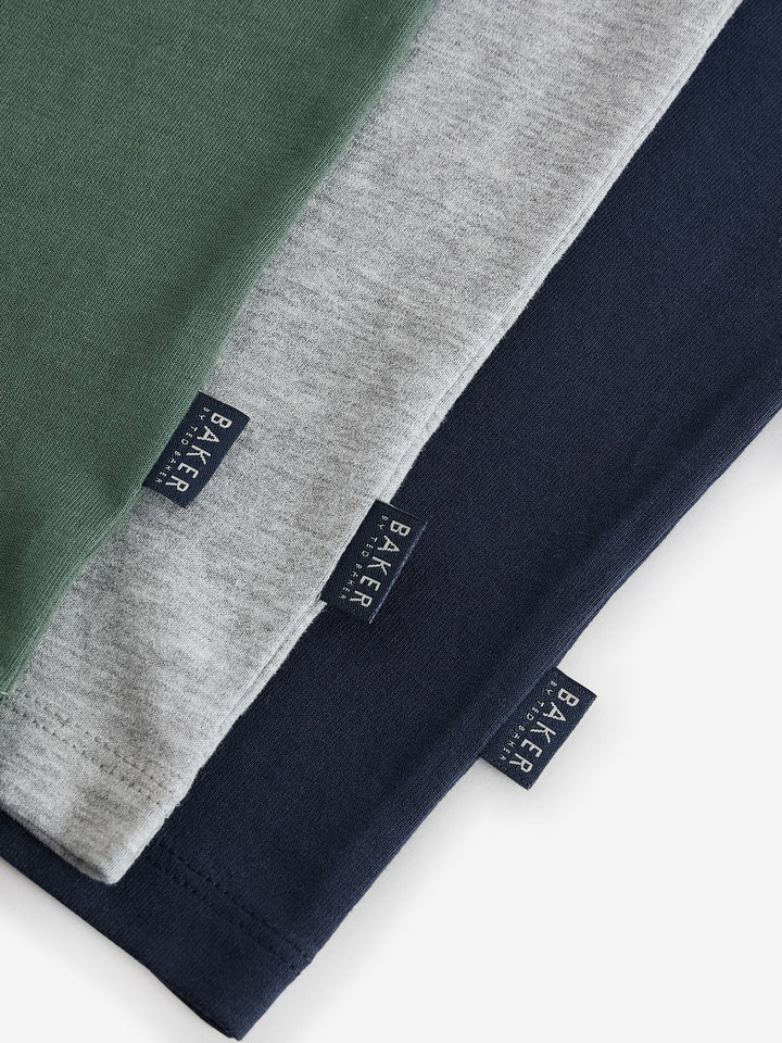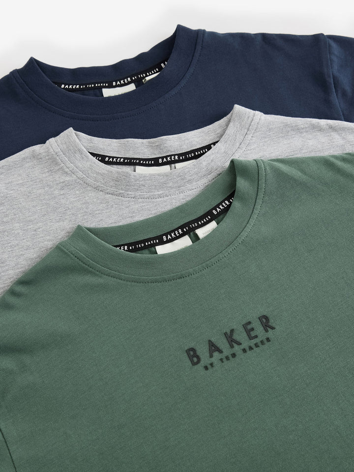 Keeping him cool and comfy, these Baker by Ted Baker t-shirts are a wardrobe must-have. The multipack includes three short sleeve tees each in a different colourway with the iconic branding printed on the front. Made from soft cotton to ensure his comfort throughout the day, they all have a simple crew neck and will be an everyday essential. T-shirt Duck Green and T-shirt Navy 100% Cotton. T-shirt Grey Melange 90% Cotton, 10% Viscose. Country of Origin: Bangladesh