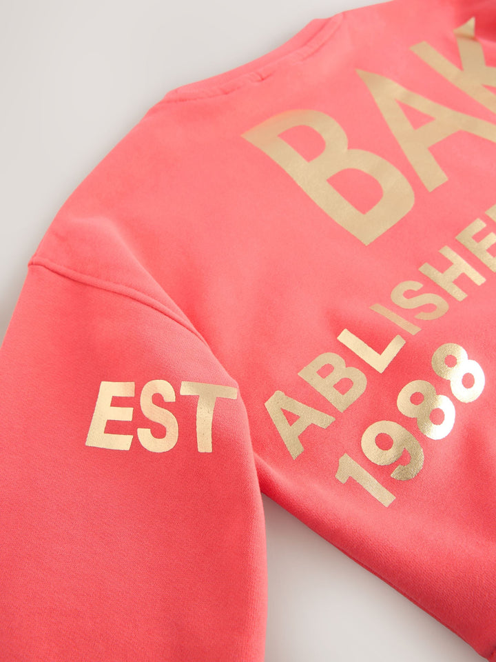 Comfort and style is combined into one with this lovely 2 piece set from Baker by Ted Baker. The set includes a soft brushback sweat top, with gold foil Baker branding at the front chest and back going across the arms and waist. The jogger comes in a lovely wide leg shape, with matching gold foil Baker branding across the back above the seam. The joggers also feature functional Baker branded ties at the waist, with dipped ends and gold eyelets. Perfect for days out or comfortable evenings at home. 2 piece set Wide leg shape Gold foil Baker branding Sweater 100% Cotton. Jogger Main 100% Cotton. Rib 95% Cotton, 5% Elastane. Country of Origin: Bangladesh