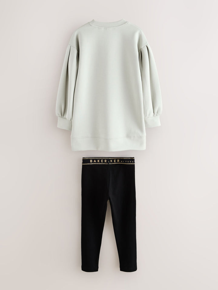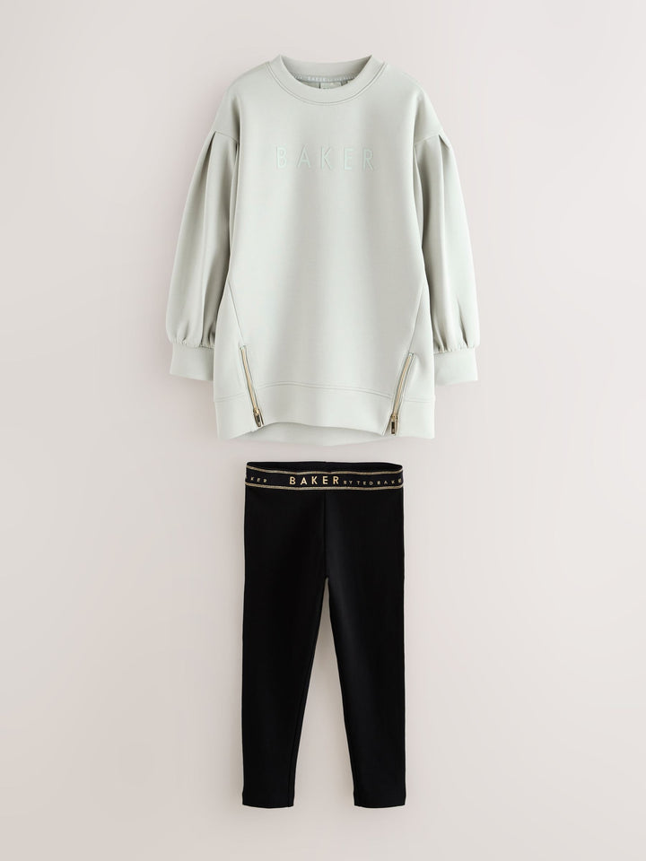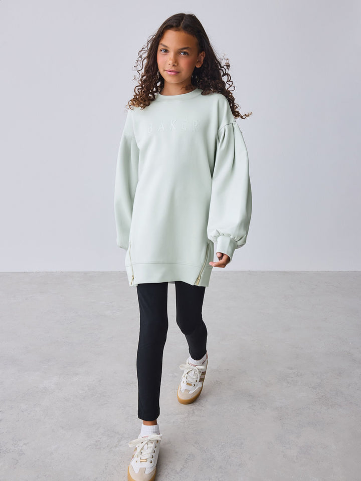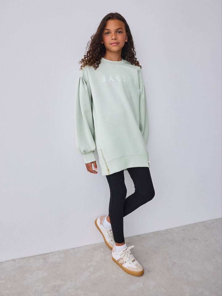 Elevate her casual wardrobe with this effortlessly cool two-piece set from BAKER by Ted Baker. The outfit pairs a longline sweat top in our new premium soft fabric, paired with classic leggings for a look that's stylish yet perfect for everyday comfort. The top comes in a gorgeous muted sage green and features a bubble shaped sleeve design for a fashionable silhouette. Signature branding is subtly detailed with highbuild Baker branding across the chest and gold branded zips at the hem add an element of modern edge. The leggings are made from a stretchy, comfortable fabric and feature a gold lurex logo waistband, making this set a perfect blend of sport-luxe and everyday practicality. Sweater 48% Polyester, 25% Modal, 23% Cotton, 4% Elastane. Leggings 92% Cotton, 8% Elastane. Country of Origin: Bangladesh