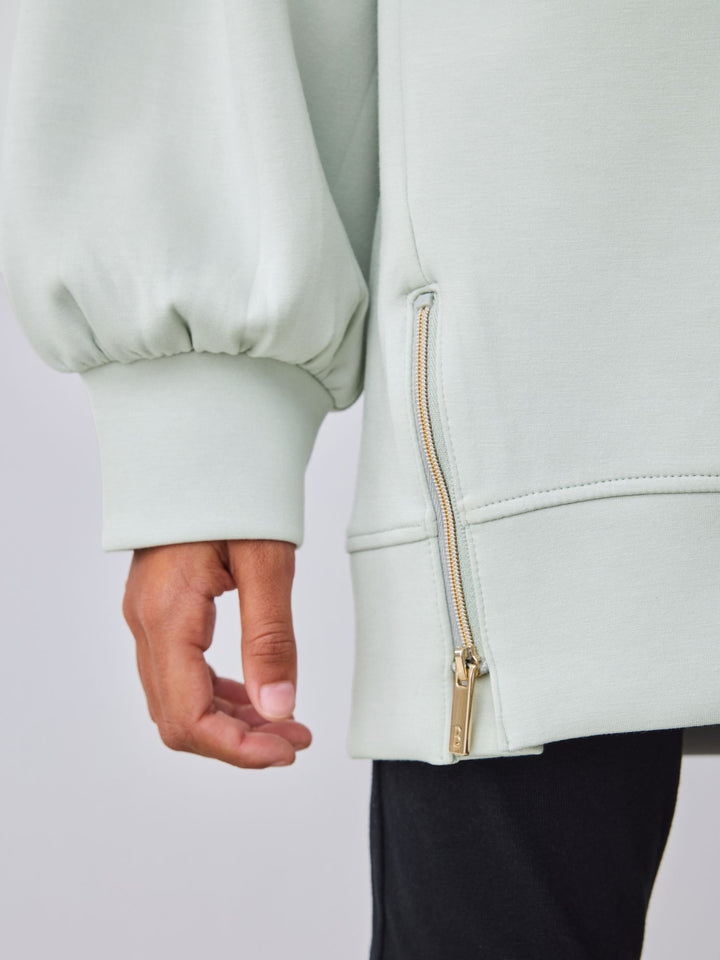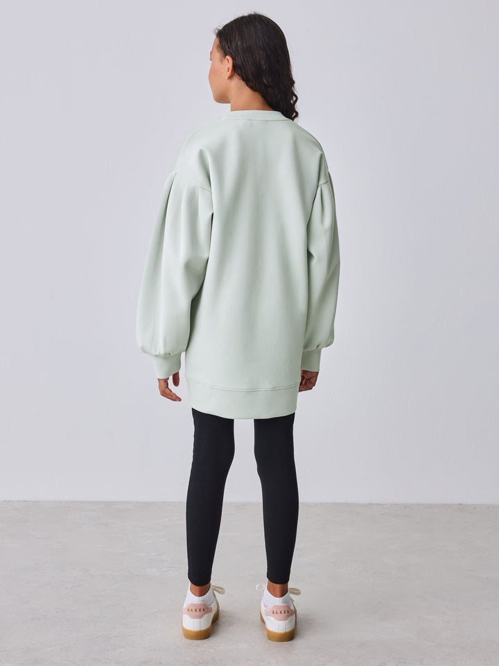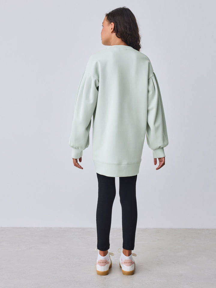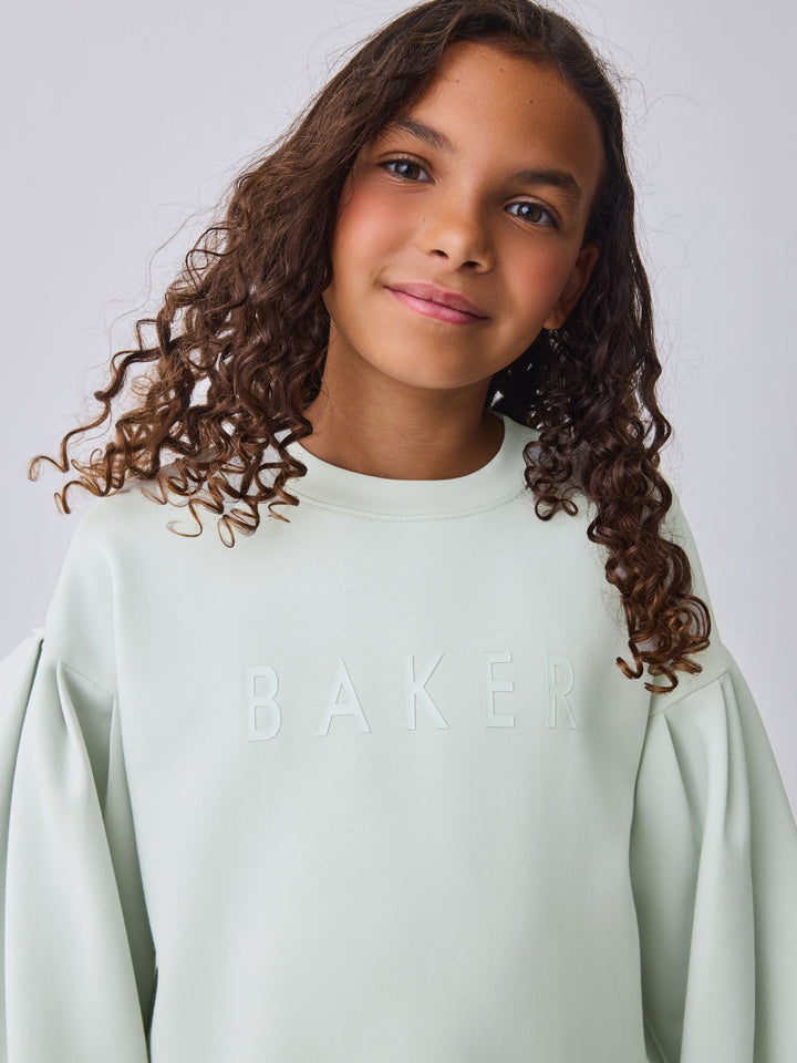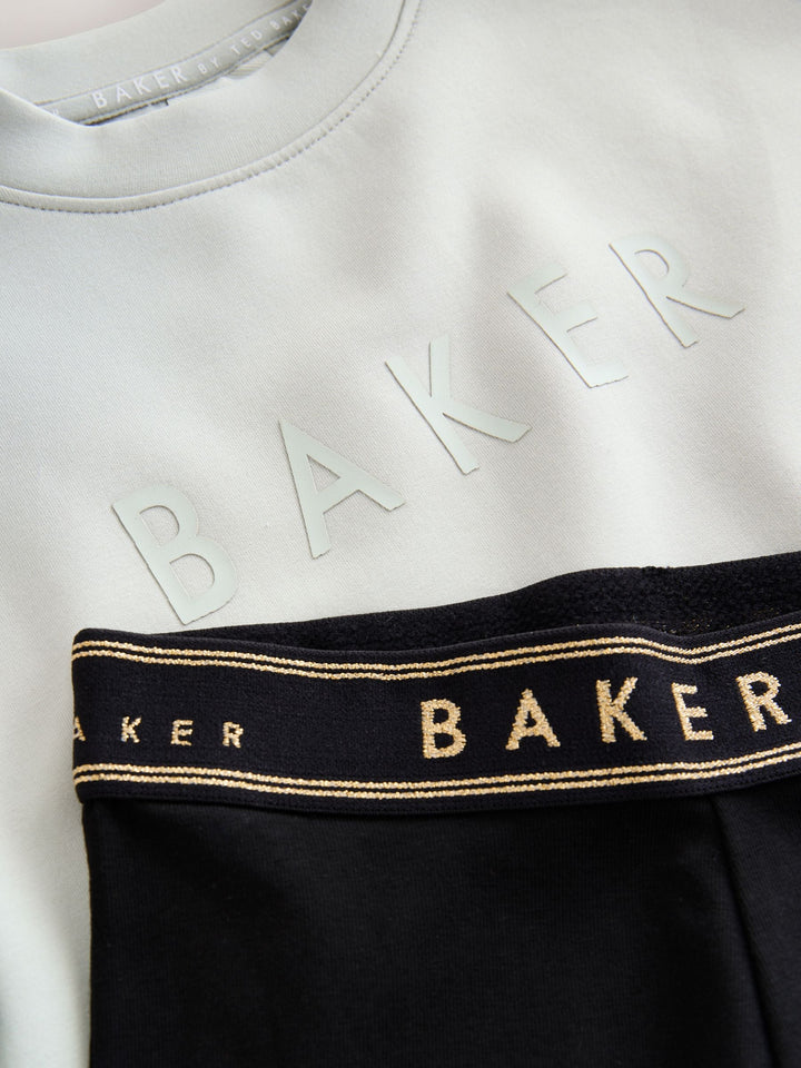 Elevate her casual wardrobe with this effortlessly cool two-piece set from BAKER by Ted Baker. The outfit pairs a longline sweat top in our new premium soft fabric, paired with classic leggings for a look that's stylish yet perfect for everyday comfort. The top comes in a gorgeous muted sage green and features a bubble shaped sleeve design for a fashionable silhouette. Signature branding is subtly detailed with highbuild Baker branding across the chest and gold branded zips at the hem add an element of modern edge. The leggings are made from a stretchy, comfortable fabric and feature a gold lurex logo waistband, making this set a perfect blend of sport-luxe and everyday practicality. Sweater 48% Polyester, 25% Modal, 23% Cotton, 4% Elastane. Leggings 92% Cotton, 8% Elastane. Country of Origin: Bangladesh