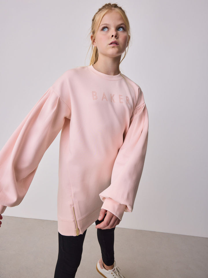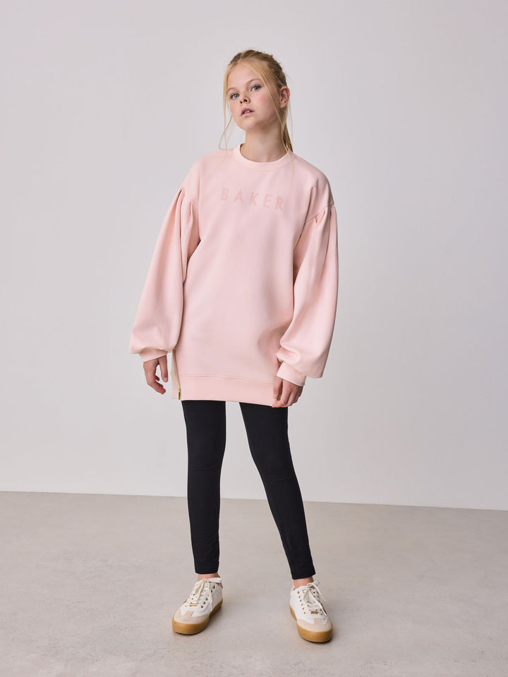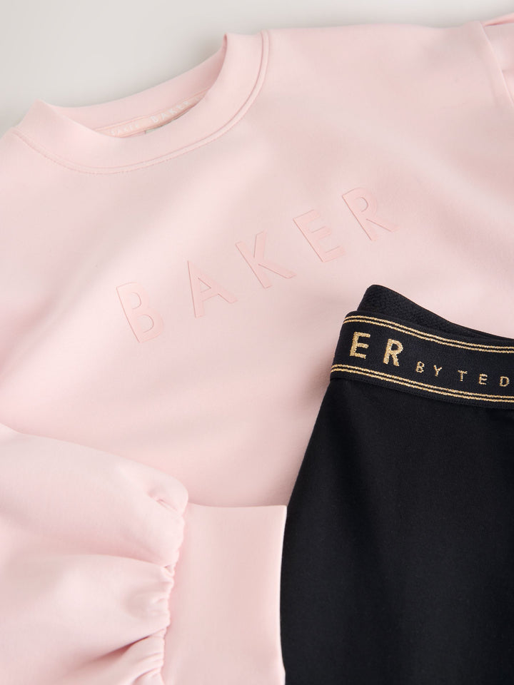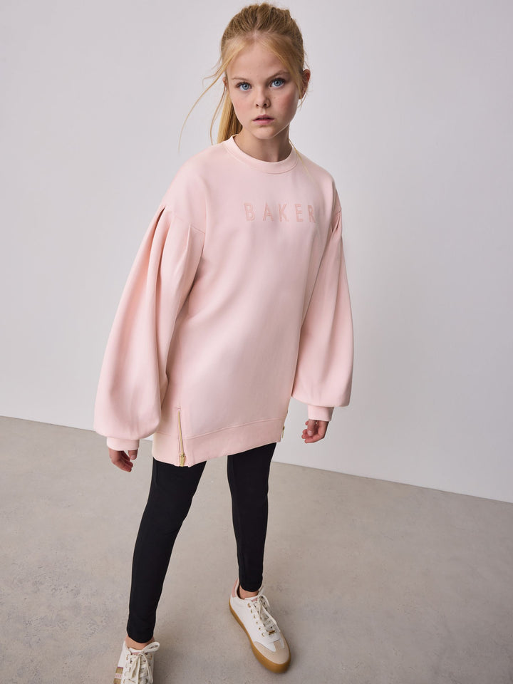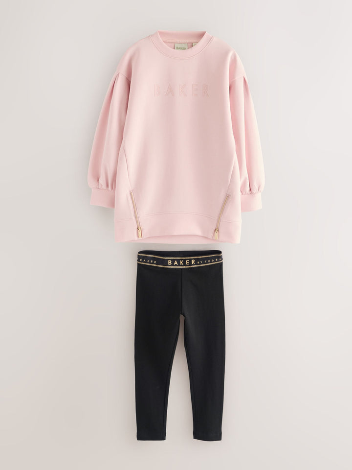 Elevate her casual wardrobe with this effortlessly cool two-piece set from BAKER by Ted Baker. The outfit pairs a longline sweat top in our new premium fabric, paired with classic leggings for a look that's stylish yet perfect for everyday comfort. The top comes in a gorgeous soft pink colour and features a bubble shaped sleeve design for a fashionable silhouette. Signature branding is subtly detailed with highbuild Baker branding across the chest and gold branded zips at the hem add an element of modern edge. The leggings are made from a stretchy, comfortable fabric and feature a gold lurex logo waistband, making this set a perfect blend of sport-luxe and everyday practicality. Sweater 48% Polyester, 25% Modal, 23% Cotton, 4% Elastane. Leggings 92% Cotton, 8% Elastane. Country of Origin: Bangladesh