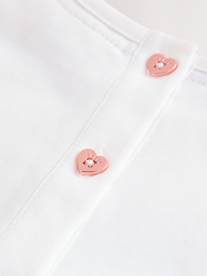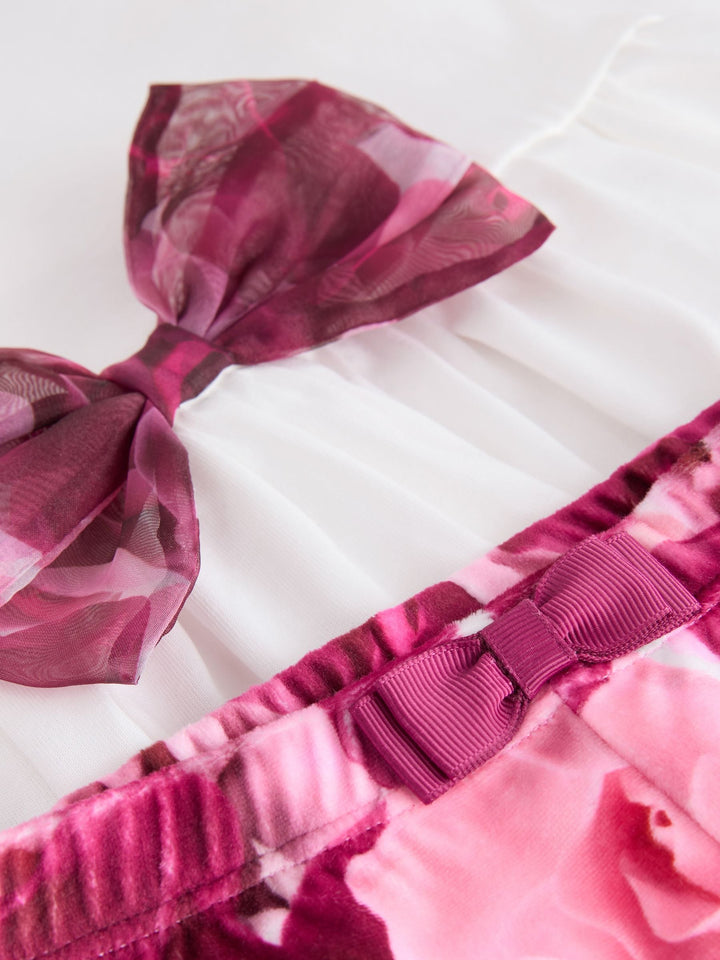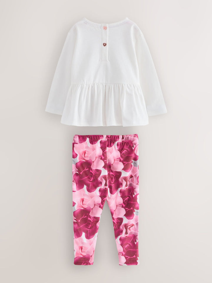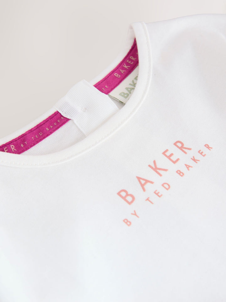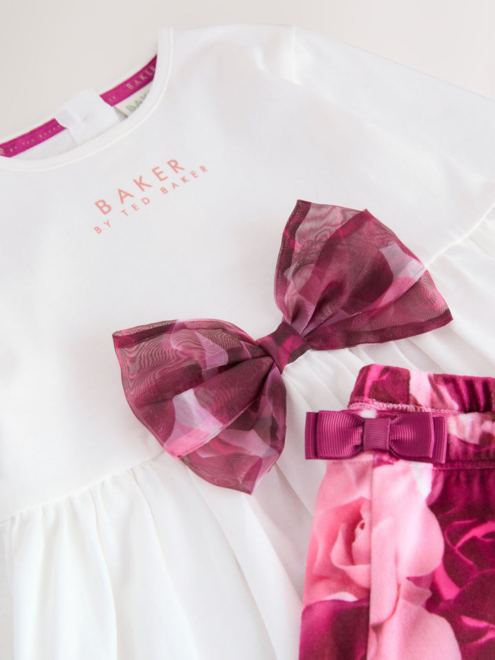 A beautiful combination of classic style and vibrant colours, this two-piece set from Baker by Ted Baker is designed to delight. The long sleeve T-short features a peplum design, with its main feature being the organza bow on the waist, finished with rose gold Baker branding on the chest. Paired with the top are the eye-catching leggings in a gorgeous soft velvet fabric, boasting our beautiful rose prints. Finishing details include a strechy elasticated waistband, and a back placket on the top with rose gold branded hardware. This set is a stunning choice for any occasion, offering comfort without compromising on signature style. T-shirt Main 100% Cotton. Bow 100% Polyester. Leggings 100% Polyester. Country of Origin: China