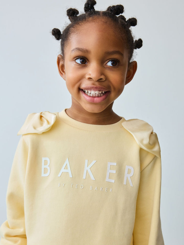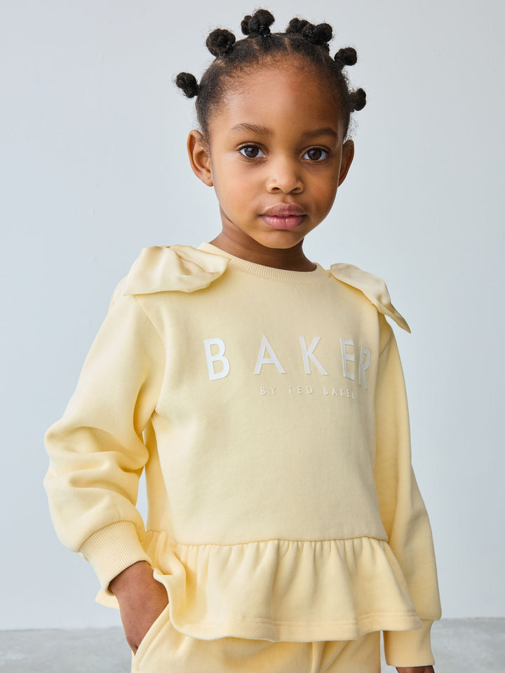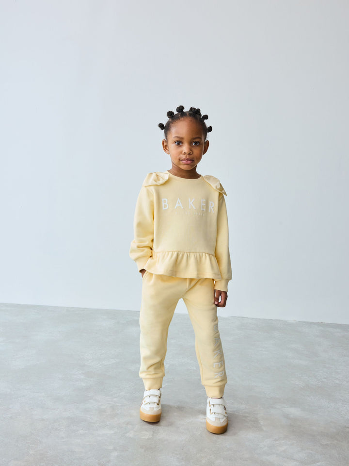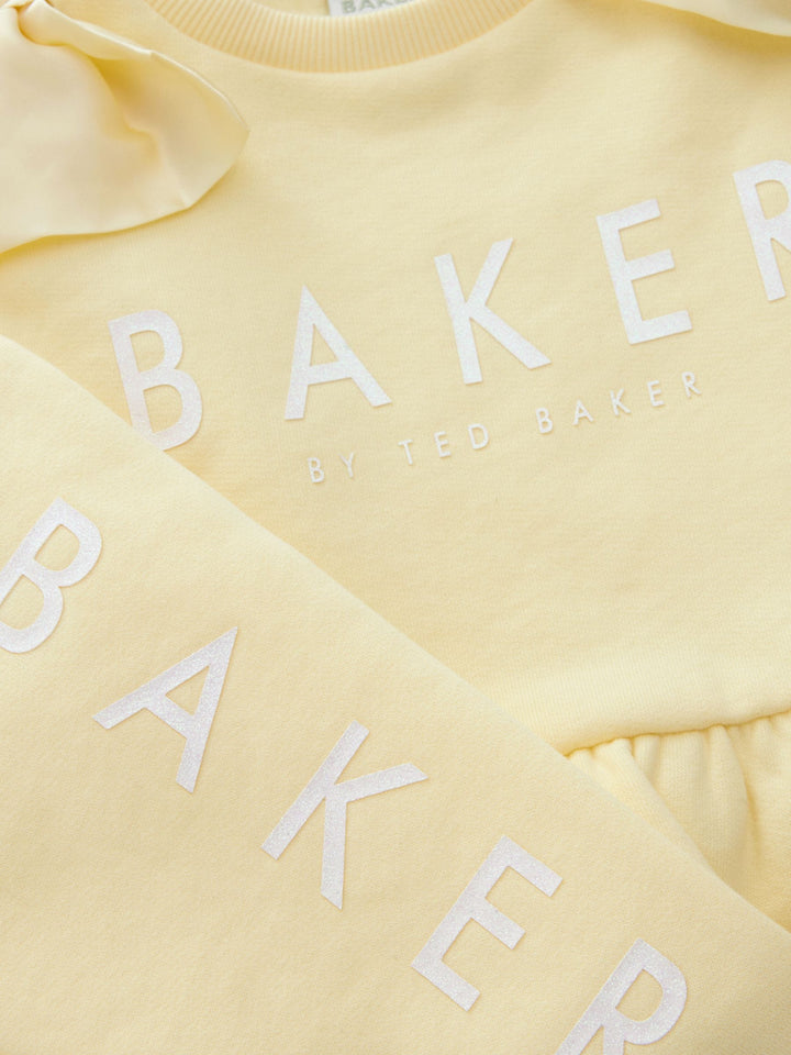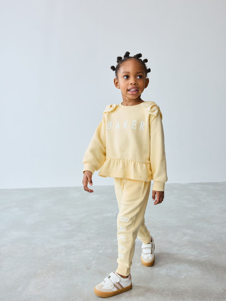 A perfect spring piece, she'll look adorable in this 2 piece set from Baker by Ted Baker. This set comes in a gorgeous buttermilk yellow, featuring a peplum hem shape on the sweat top with satin bows on the shoulders, and white glitter printed Baker branding on the chest. The joggers include matching glitter Baker branding on the side of the leg and functional pockets. 2 piece set Peplum hem design Satin bow features Sweater and Jogger Main 100% Cotton. Rib 95% Cotton, 5% Elastane. Country of Origin: Bangladesh