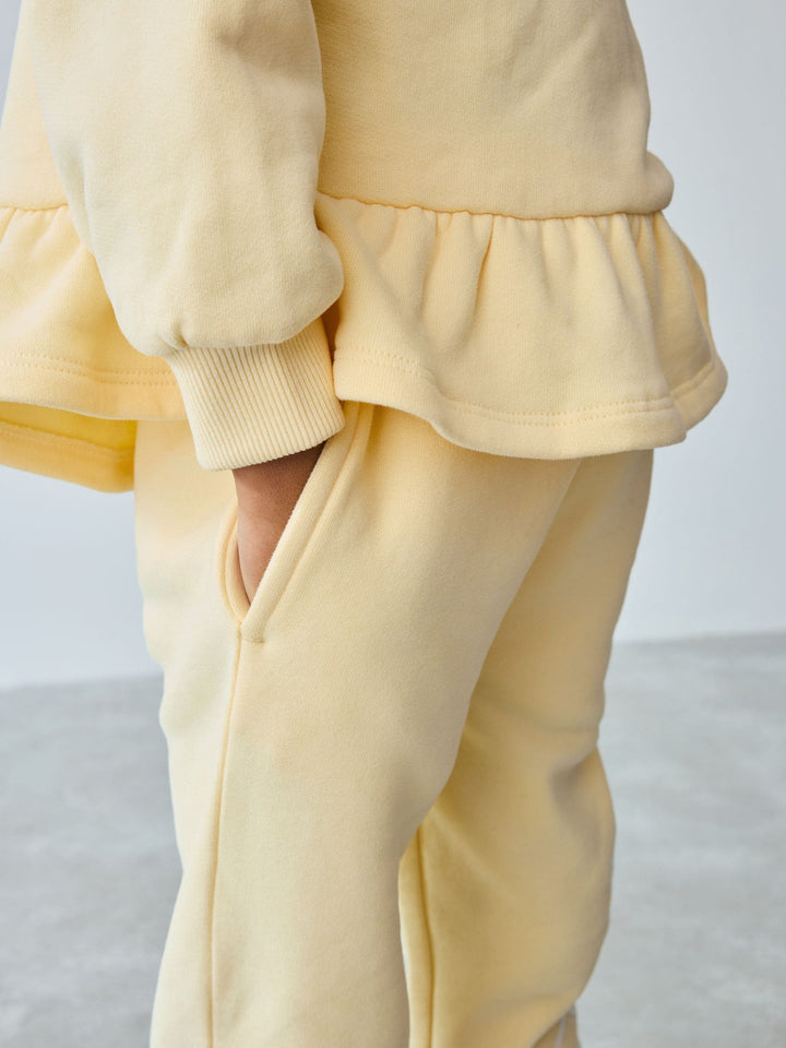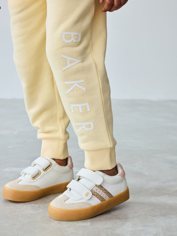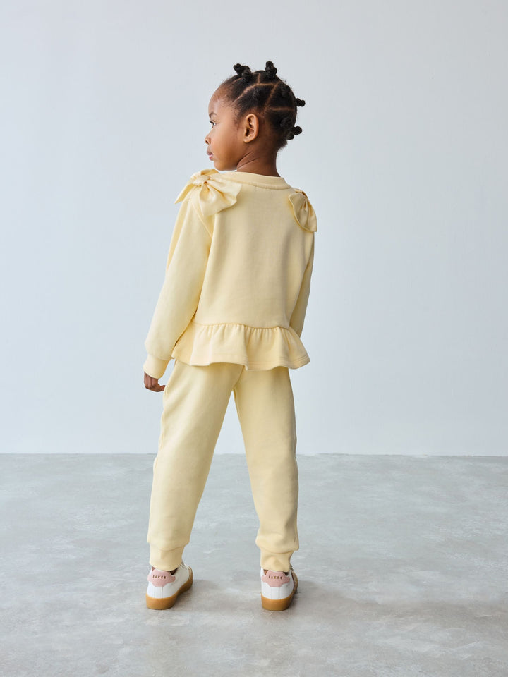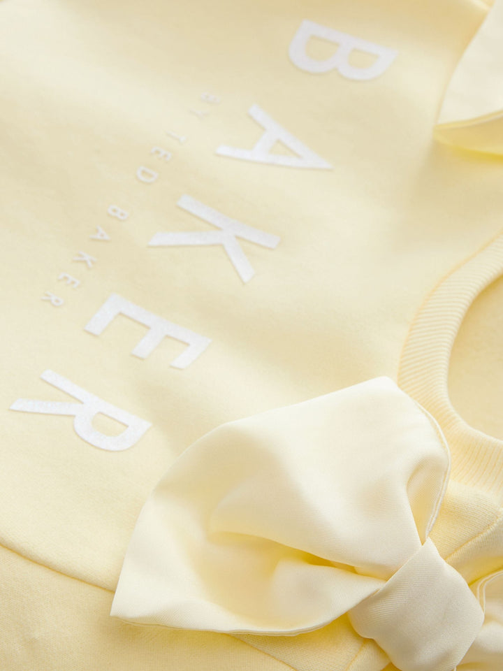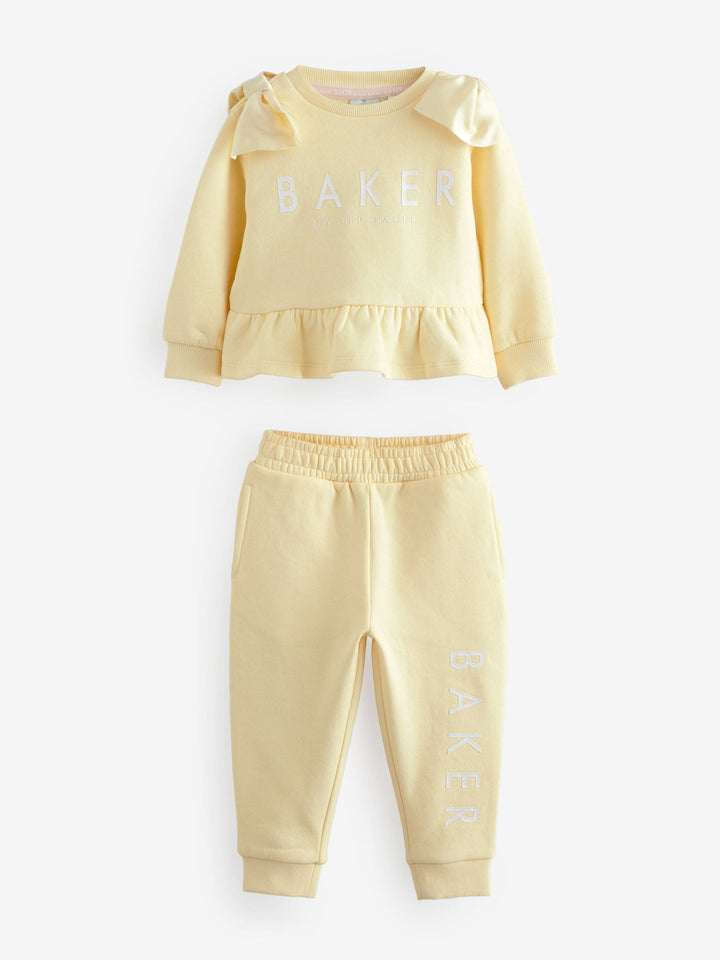 A perfect spring piece, she'll look adorable in this 2 piece set from Baker by Ted Baker. This set comes in a gorgeous buttermilk yellow, featuring a peplum hem shape on the sweat top with satin bows on the shoulders, and white glitter printed Baker branding on the chest. The joggers include matching glitter Baker branding on the side of the leg and functional pockets. 2 piece set Peplum hem design Satin bow features Sweater and Jogger Main 100% Cotton. Rib 95% Cotton, 5% Elastane. Country of Origin: Bangladesh