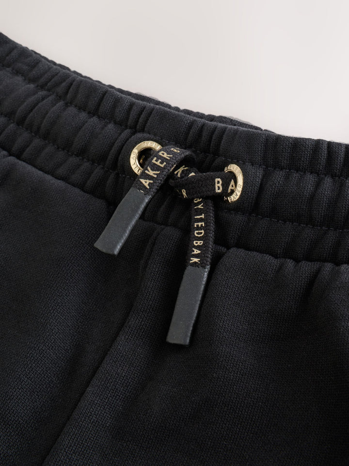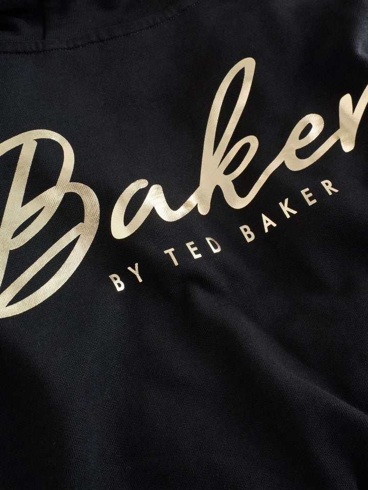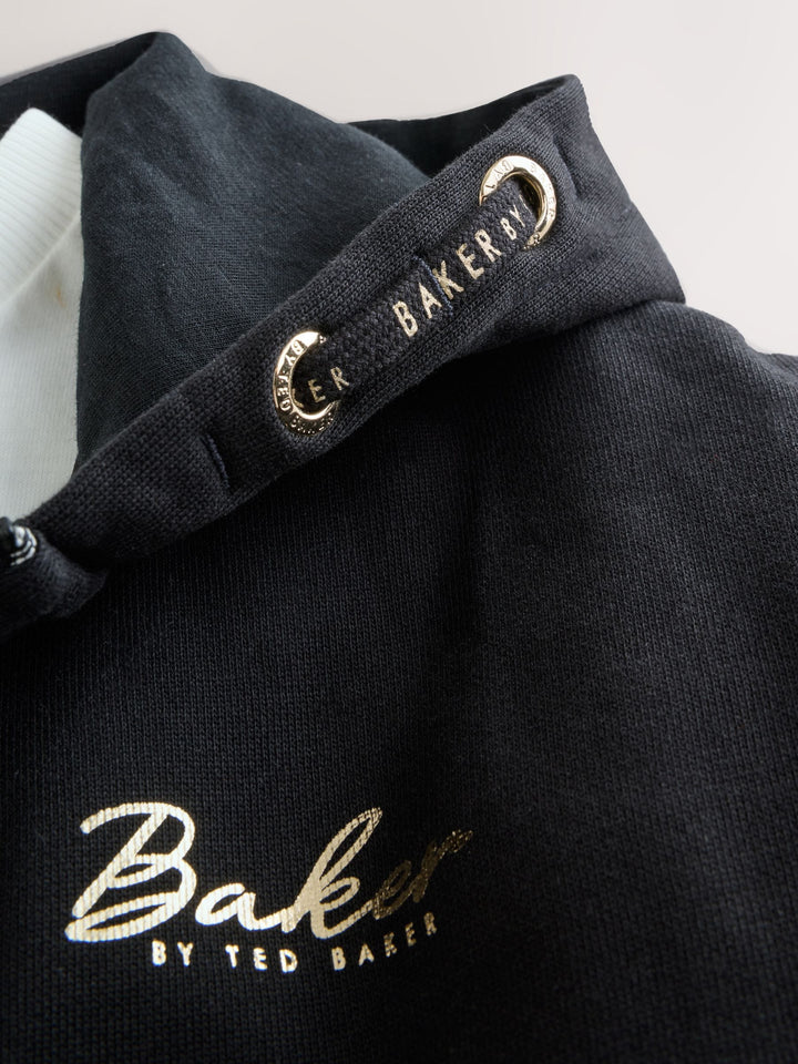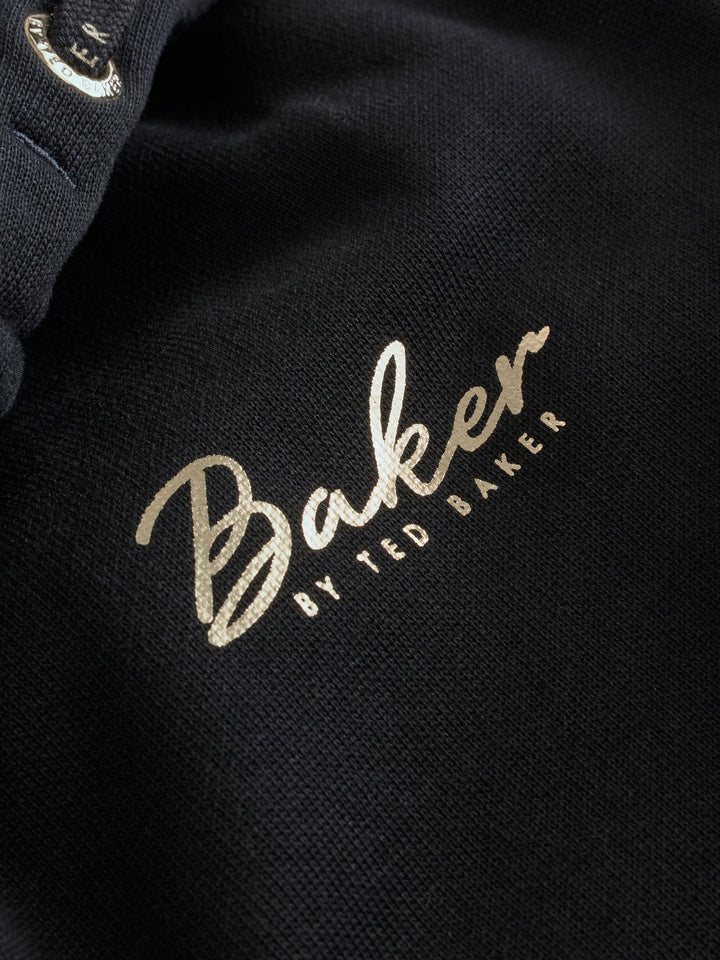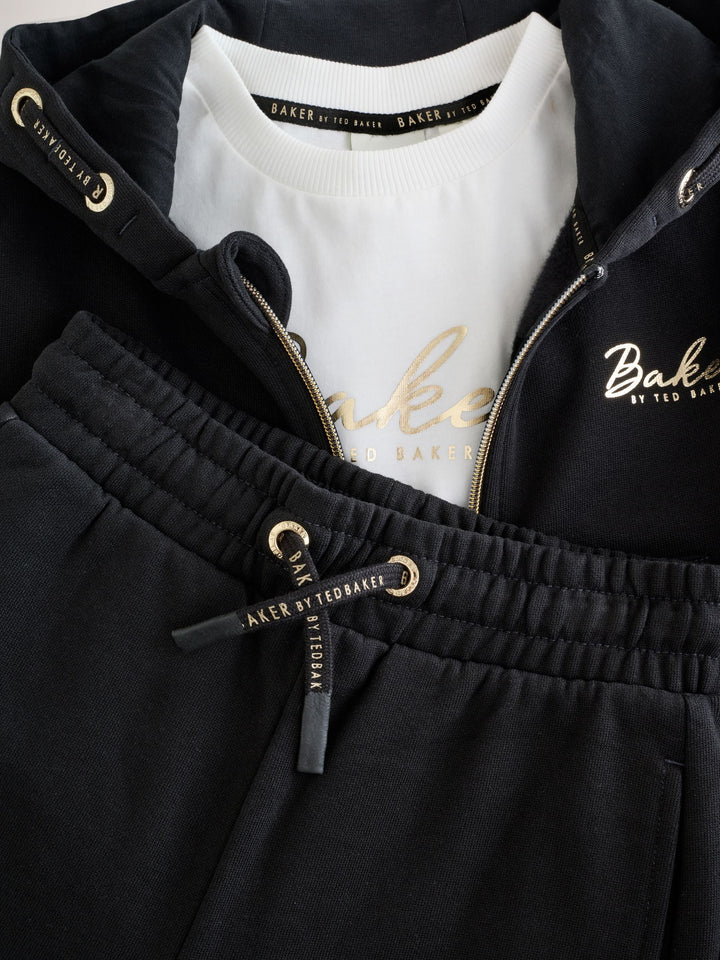 Introduce elevated casualwear to her wardrobe with this chic, three-piece co-ord set from Baker by Ted Baker. This sleek 3 piece set features a matching zip-through hoodie and wide-leg joggers in timeless black, with a white short sleeved T-Shirt layered underneath. The hoodie features a modern boxy cropped length, with gold foil Baker braanding on the chest and across the back, finished with our gold branded zip puller. The joggers offer a contemporary wide-leg fit and a comfortable elasticated, adjustable drawstring waist. The T-Shirt is complimented with our soft gold Baker foil branding. Finishing details include gold branded drawcords and eyelets, adding a touch of luxury to the casual aesthetic. T-shirt, Jacket and Jogger Main 100% Cotton. Rib 95% Cotton, 5% Elastane. Country of Origin: Bangladesh
