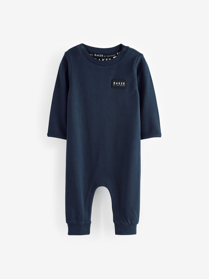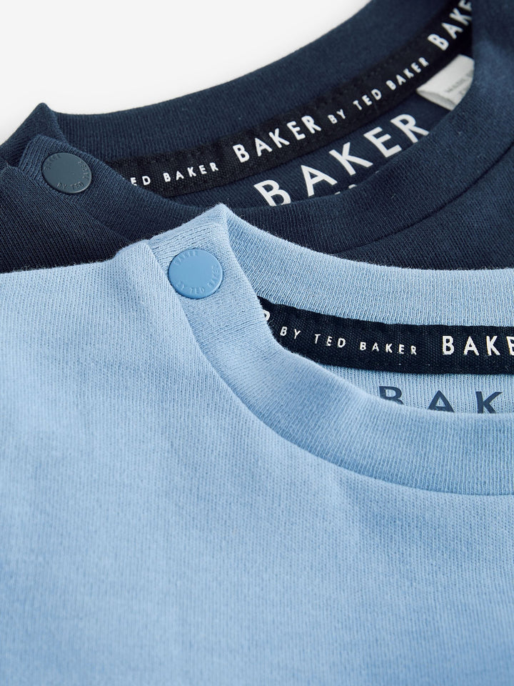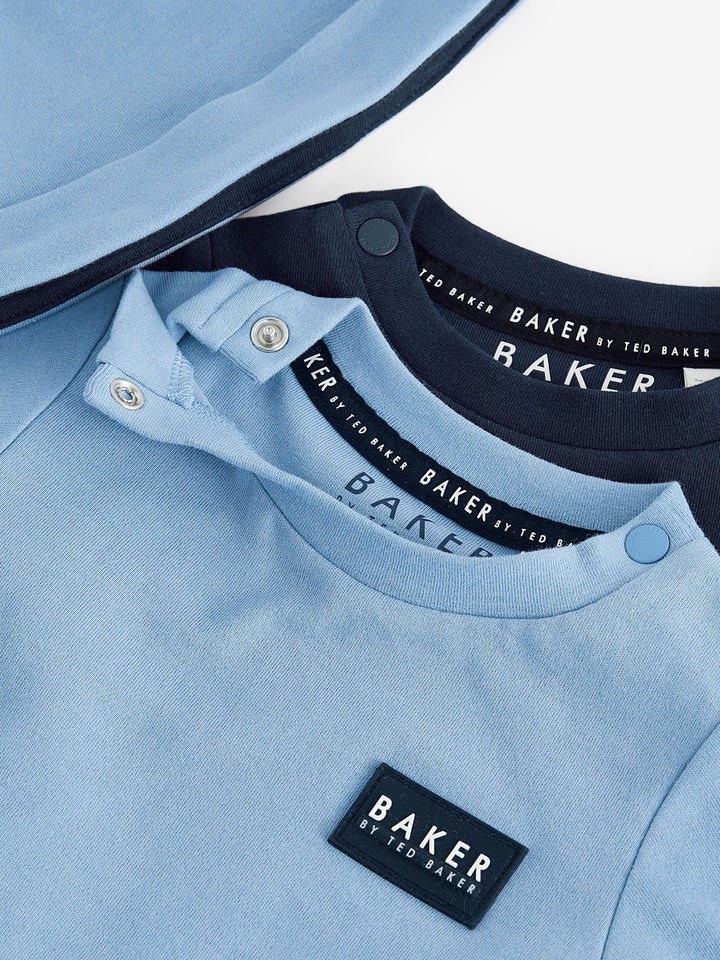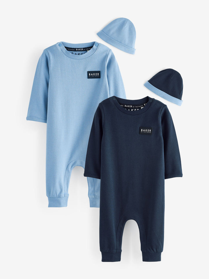 The perfect addition to their first wardrobe, this multipack of sleepsuits from Baker by Ted Baker blend comfort and style. Designed in a premium soft cotton, the two pack includes one navy and one light blue romper that are both fitted with a branded chest badge detail and popper fastenings for easy changing. A charming gift, the set is completed with matching hats. Soft cotton Popper fastenings Branded badge Matching hat Romper, Romper and Hat 100% Cotton. Country of Origin: China