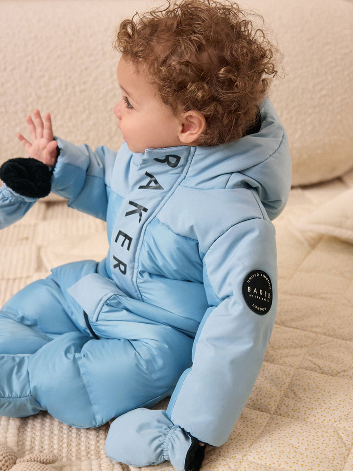 Let your little one explore in style with the Baker by Ted Baker Blue Shower Resistant Snowsuit. This snug snowsuit is perfect for cold-weather adventures, keeping them warm and dry. It features an eye-catching blue design with bold BAKER branding printed down the placket, a branded badge on the sleeve, and a stylish branded zip puller. The snowsuit comes with convenient, removable gloves to keep tiny hands toasty. Designed for practicality as well as style, this snowsuit is shower resistant to protect against light rain and snow. Please note that older sizes do not have built-in feet, allowing for more room to grow and for wearing with boots. Branded detailing Zip fastening Removable gloves Main 100% Polyester. Lining 100% Polyester. Wadding 100% Recycled polyester. Country of Origin: China Shower resistant, water repellent finish to provide protection against light rain., Made from durable fabric., Extra warm protection against cold temperatures.
