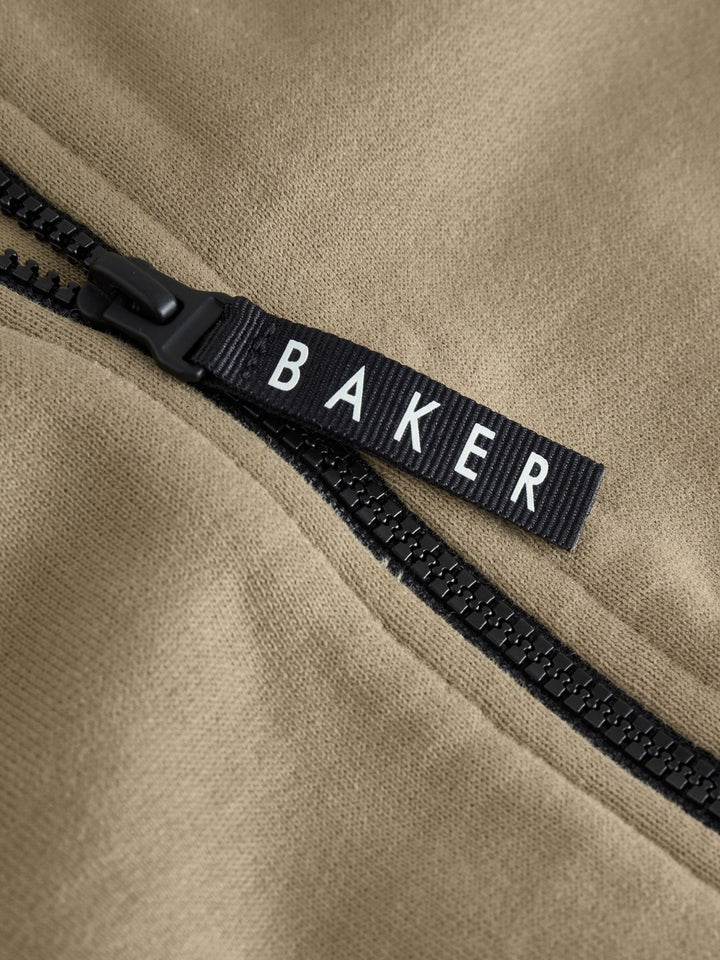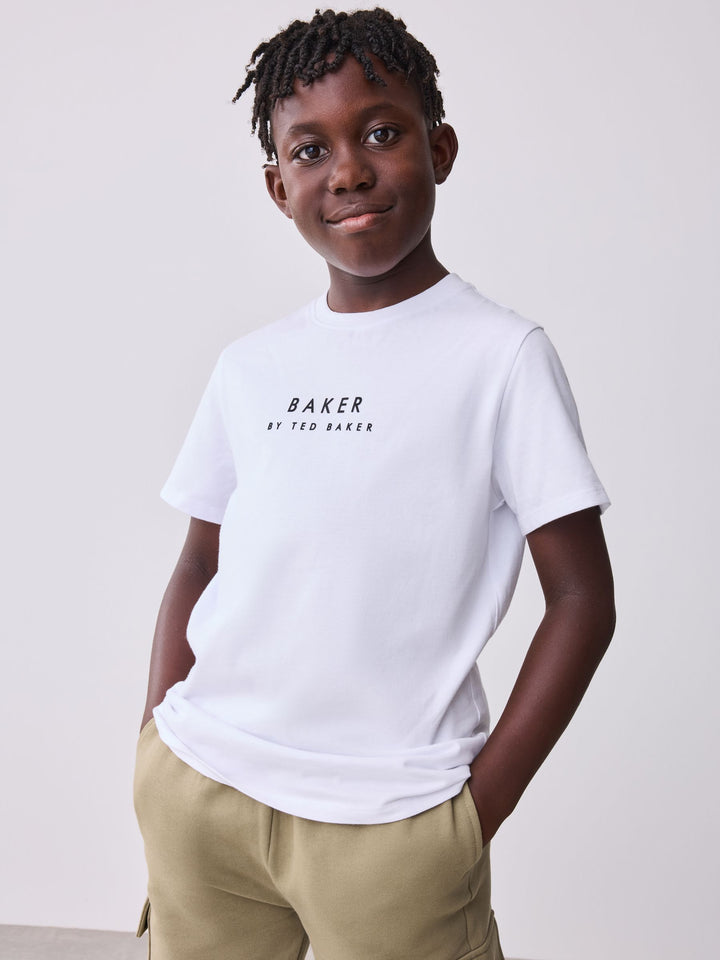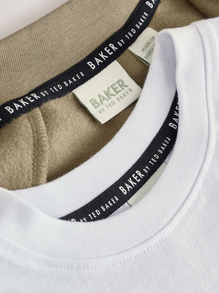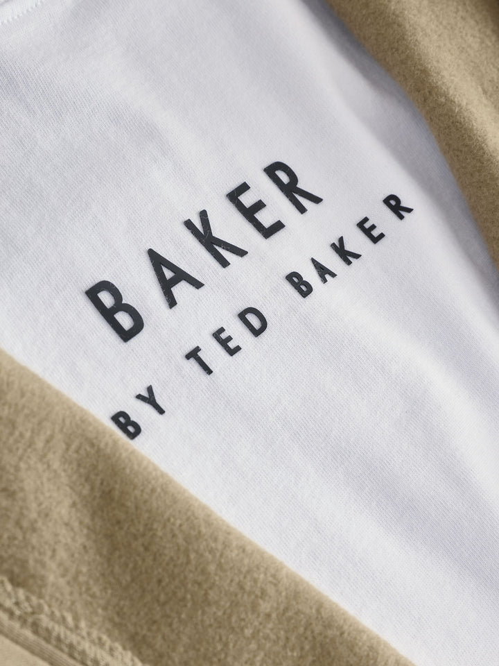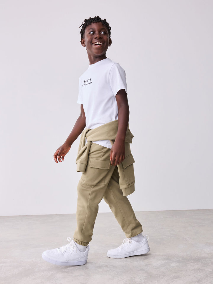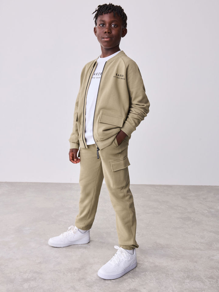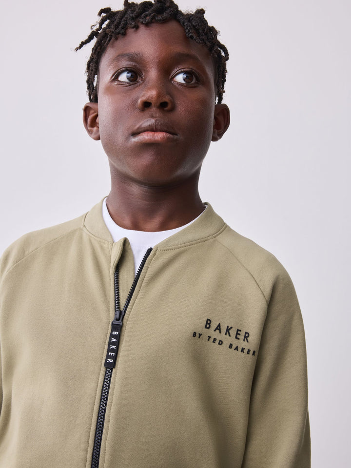 Dress him in effortless style with the Baker by Ted Baker Bomber Jacket, T-Shirt, and Joggers Set. This coordinated three-piece outfit offers both comfort and a cool, modern look. The khaki bomber jacket features subtle Baker by Ted Baker branding on the chest and a matching branded zip puller. It's perfectly paired with a classic white branded t-shirt. Completing the set are the matching khaki joggers, which come with stylish cargo pockets and a comfortable elasticated waist with a toggle detail for a perfect fit. 3 piece set Branded details Cool and comfortable Jacket, Jogger and T-shirt Main 100% Cotton. Rib 95% Cotton, 5% Elastane. Country of Origin: Bangladesh
